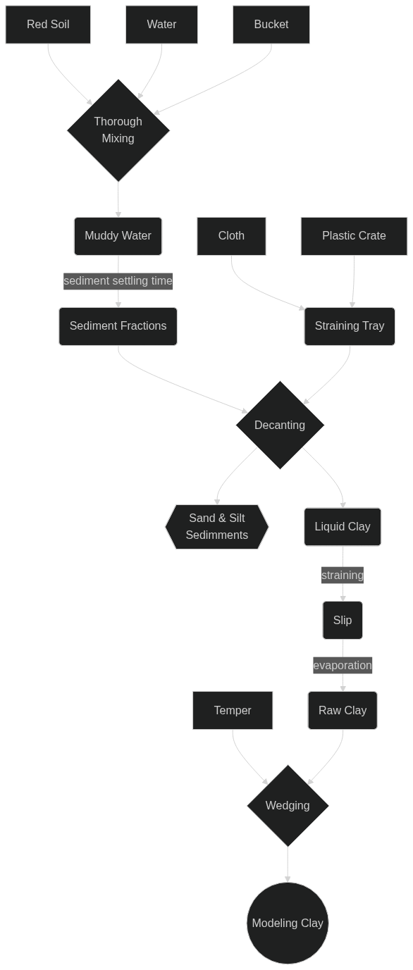 The tech tree shows inputs (resources consumed) as sharp boxes, intermediate materials as rounded boxes, major (laborious) processing actions as diamonds, waste products as hexagons, and the final product (modeling clay) as a circle at the bottom. Waste water is not diagramed, but is lost during decanting, straining, and evaporative steps. Non-laborious processes are labeled along arrows.