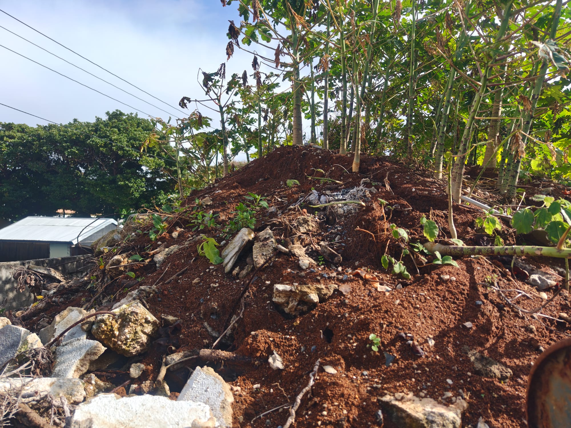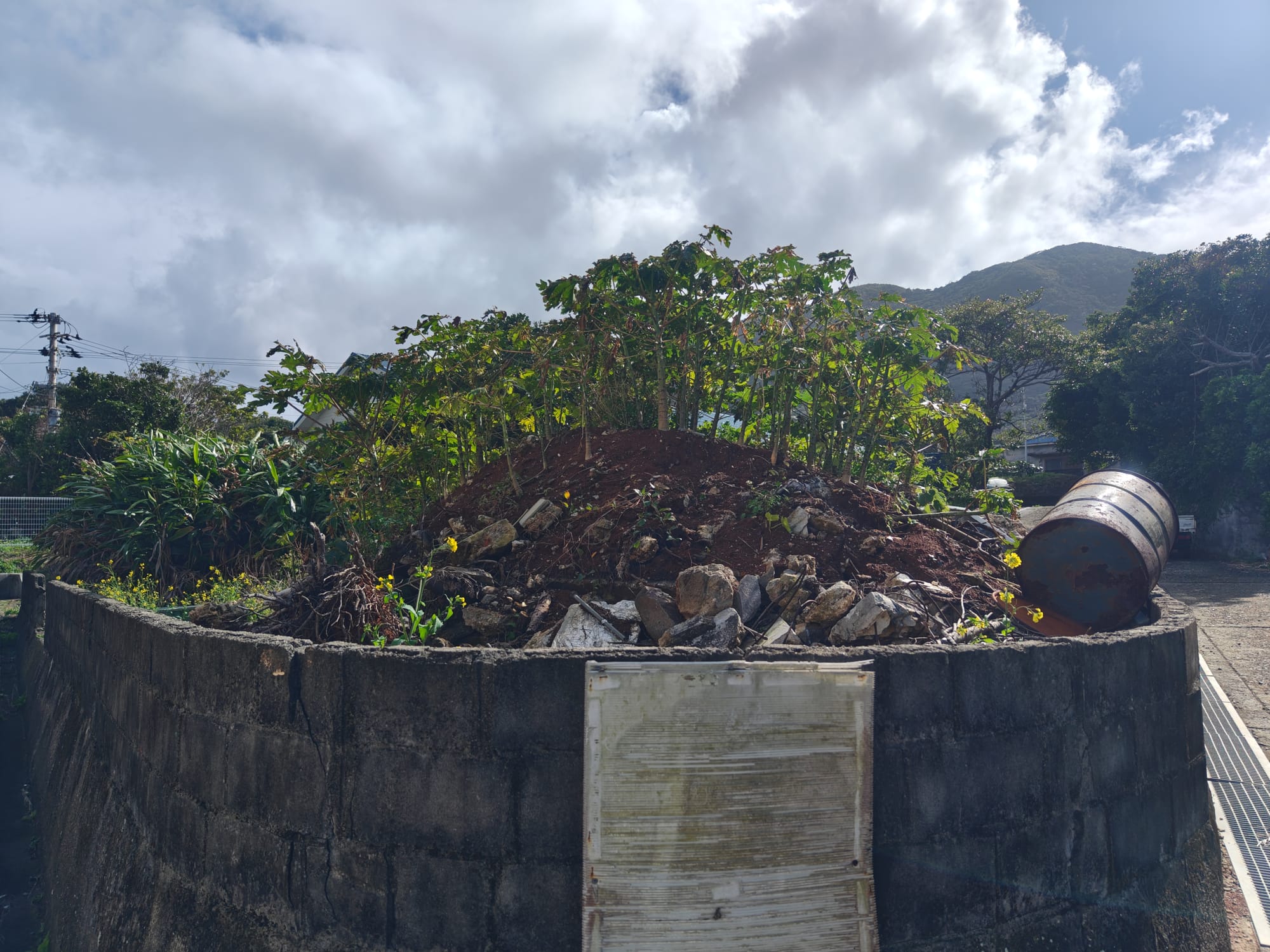 Locating clay-rich soils on Takarajima is rather simple: look down. It is almost harder to find clay-poor soils, which is convenient for this project. I was able to collect some great red soil from a pile of rubble at a nearby construction site. Constructions sites are great for collecting soil since it is often turned-over (and thus loose), piled up for easy access and usually viewed as waste anyways. It is not often missed if taken, though you should always get permission, beforehand. By the time I finished my first pots, the construction workers had already completely cleared away the glorious mound, leaving me to find another source of clay for future batches.