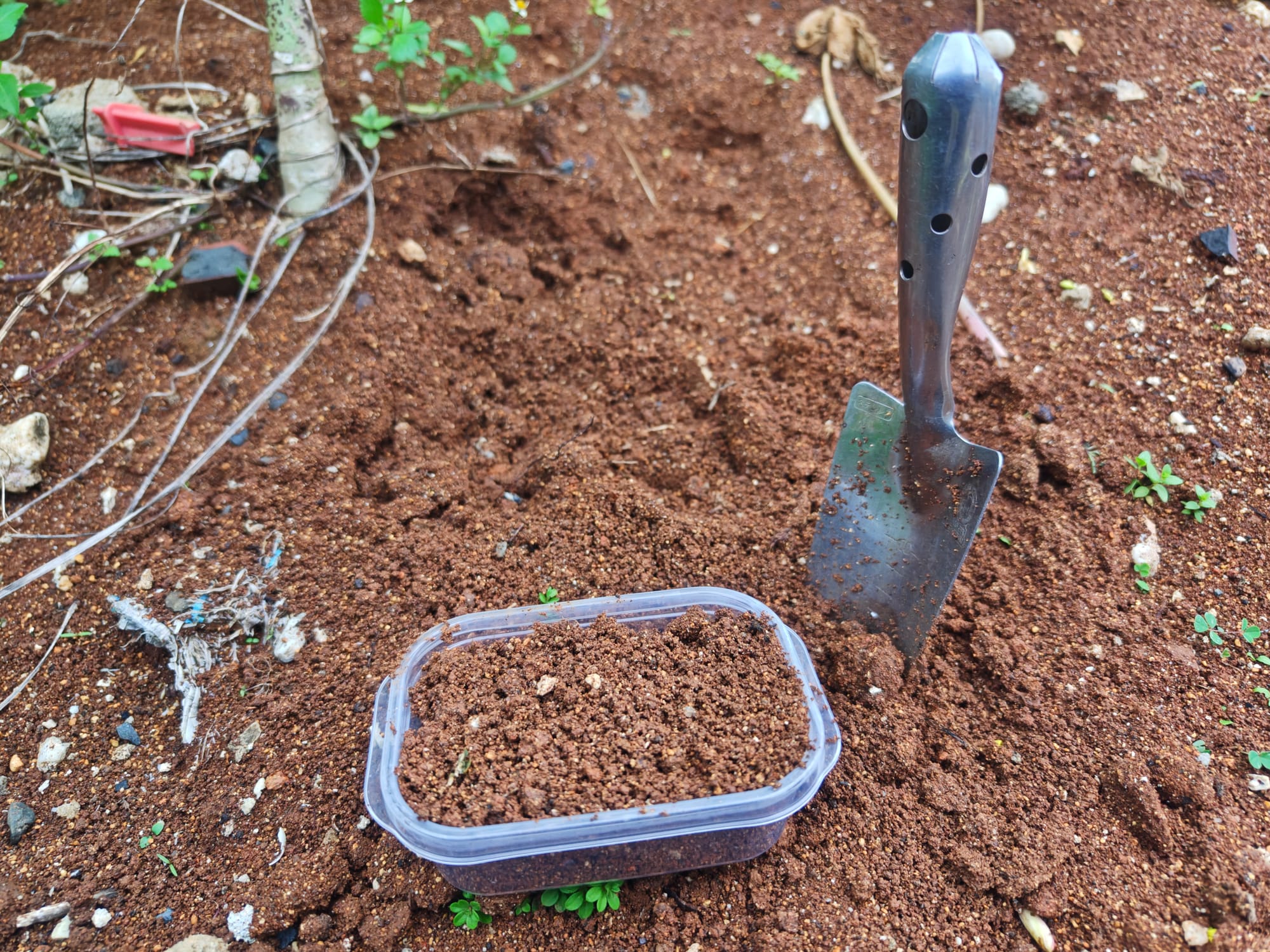 Collecting soil from the big red pile.