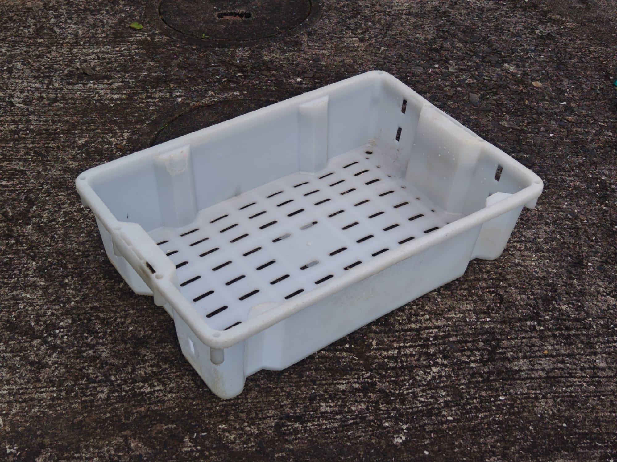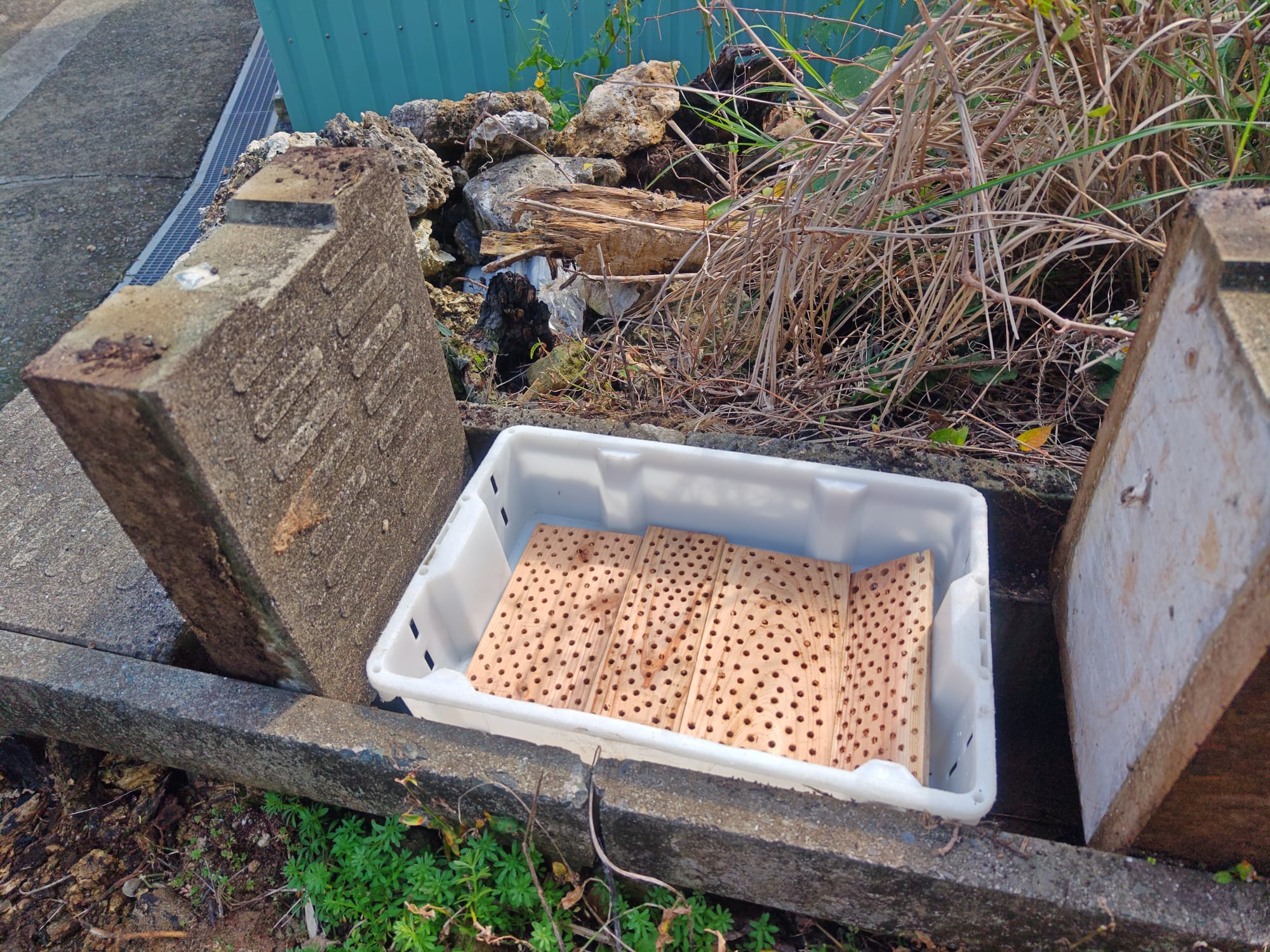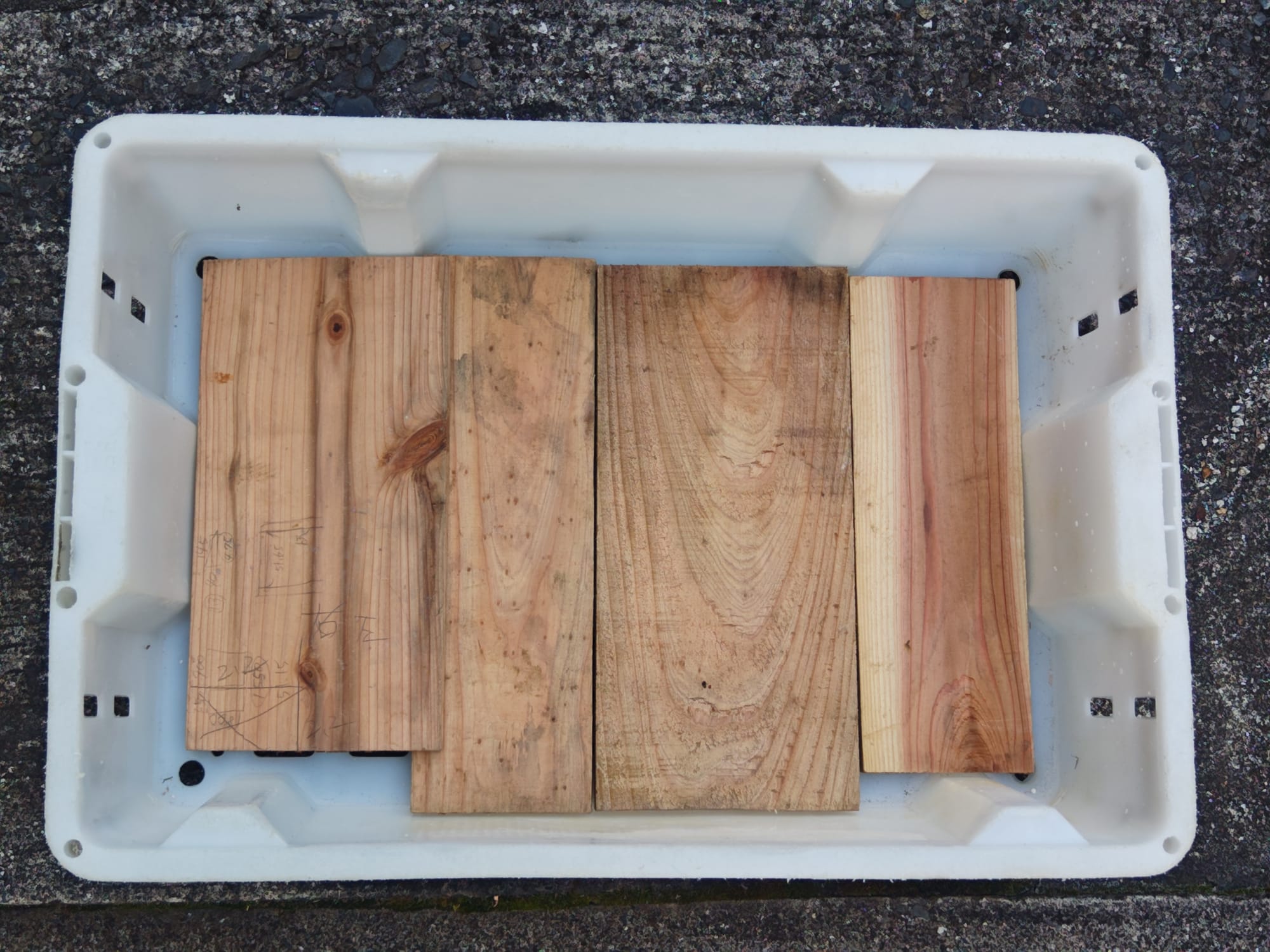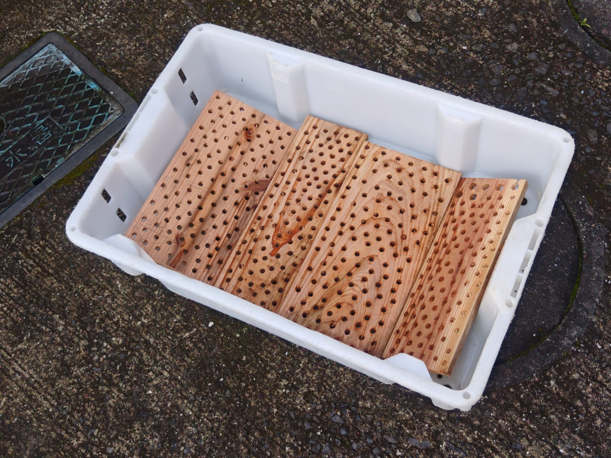 From the salvaged fishing crates, the curtain, and several planks of scrap wood discarded by the same construction site as before, I prepared trays for straining the water off the liquid clay. Drilling holes in the wooden planks allows water to flow more freely beneath the curtain fabric, which is used as a filter. Since wood is porous, it also helps to absorb some moisture out of the clay. The bottoms of the crates were lined with a layer of planks, then fabric to complete the strainer. Think "coffee filter" but for clay.