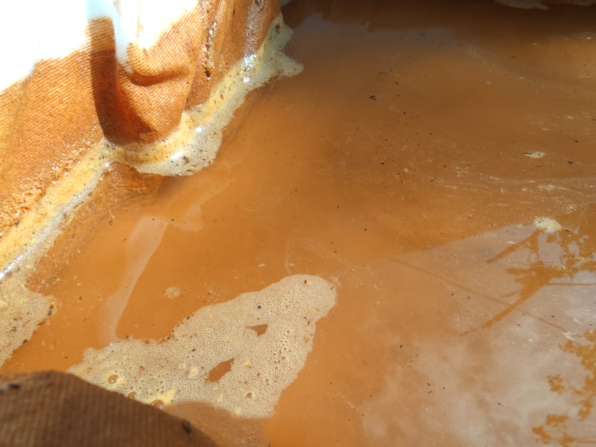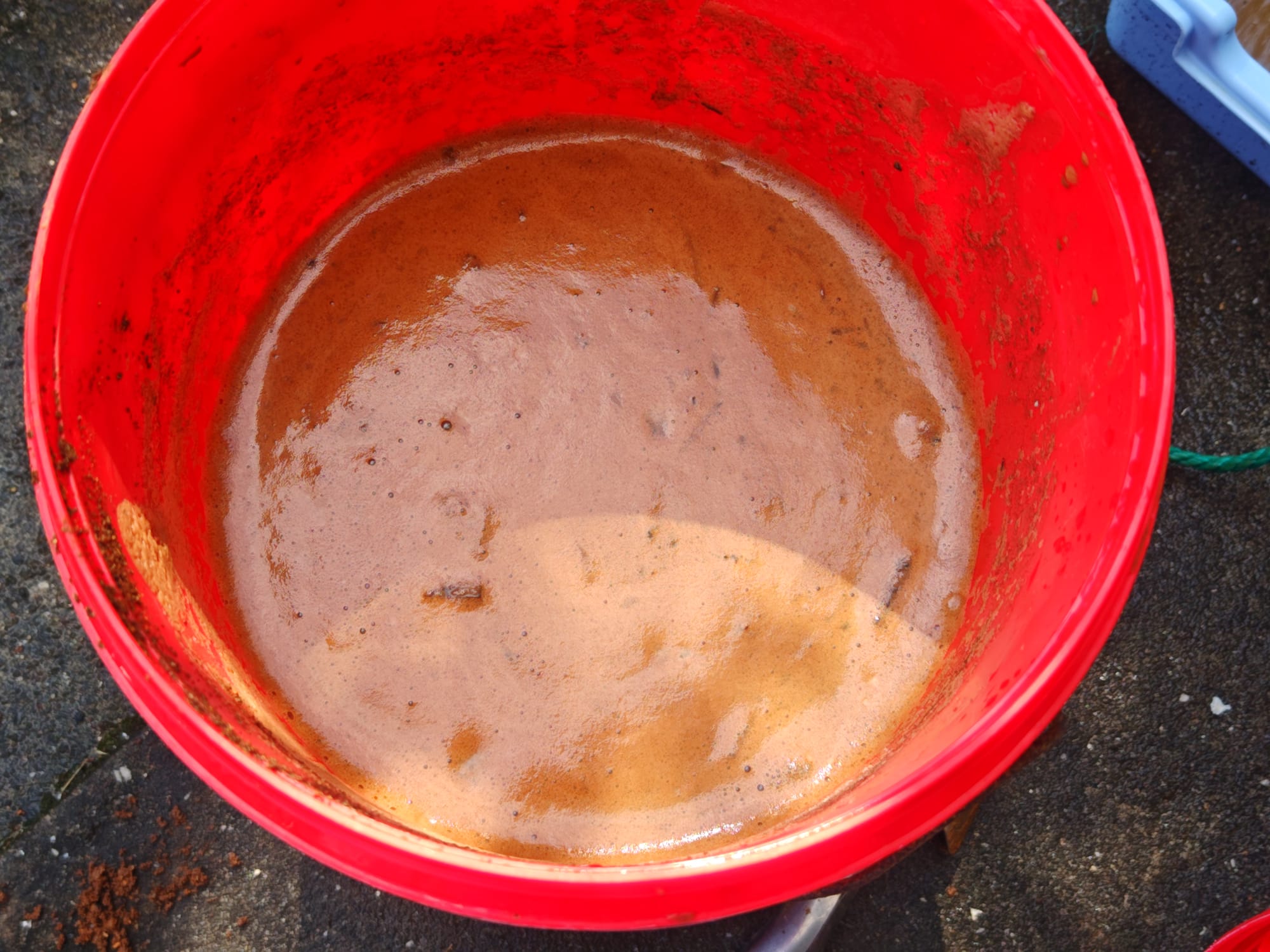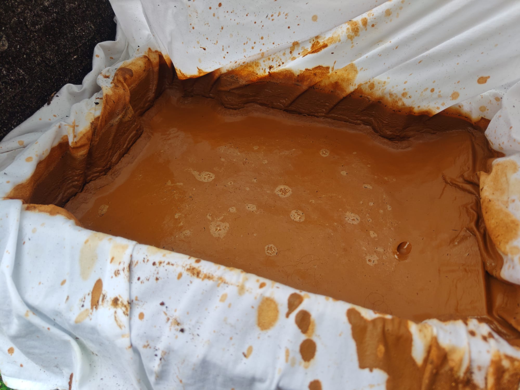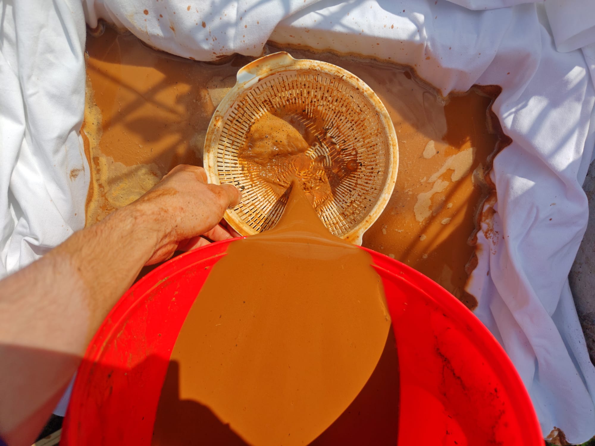 At this point, the bucket contained a large fraction of very thin liquid clay atop a smaller but thicker fraction of mud containing mainly silt, sand, and gravel. This made it easy to gently decant the liquid fraction on top into a straining tray by carefully tipping the bucket. Slow and careful was key. The liquid seemed very thin as it flowed just like ordinary water, but there was much more clay in suspension than what the viscosity hinted at. It was important not to pour off anything other than the liquid clay at this stage, since nearly all solids past this stage made it into the final product.