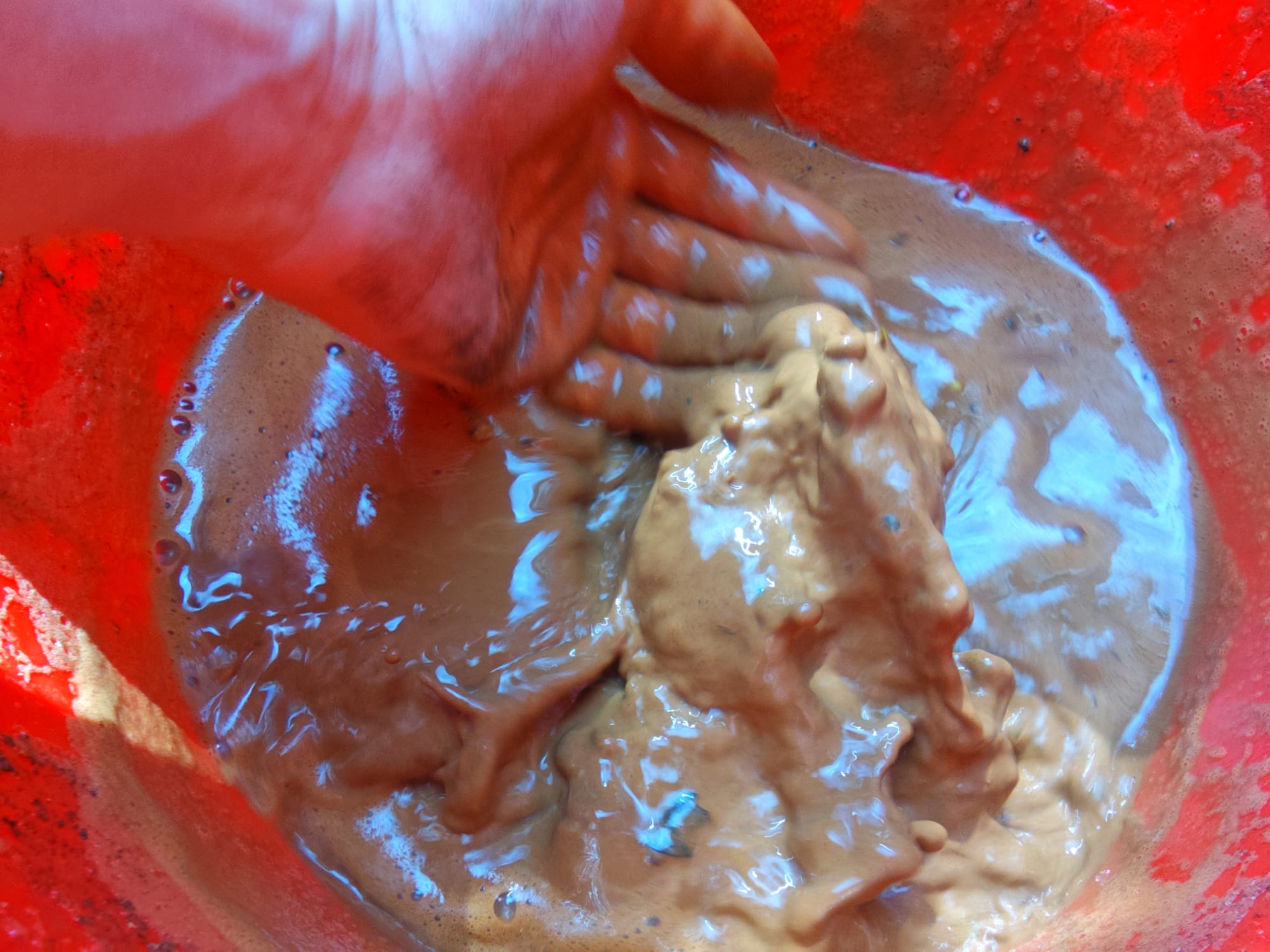 Breaking up the larger clumps of soil, I combined everything in the bucket with water for wet processing. It is necessary to very thoroughly mix the soil with the water, often mashing larger clumps to release the finest clay particles into suspension. This can be done any number of ways, but I did it with my bare hands (for free). The goal is to produce a liquid clay colloid where as much of the clay content of the soil is suspended in the water as possible. By waiting about a half hour after mixing, essentially all of the larger components of the soil - including gravel, sand, and silt - settle to the bottom of the bucket as a thick, consolidated layer of mud. Light organic matter floated to the top and could be skimmed off or filtered out with a simple kitchen strainer.