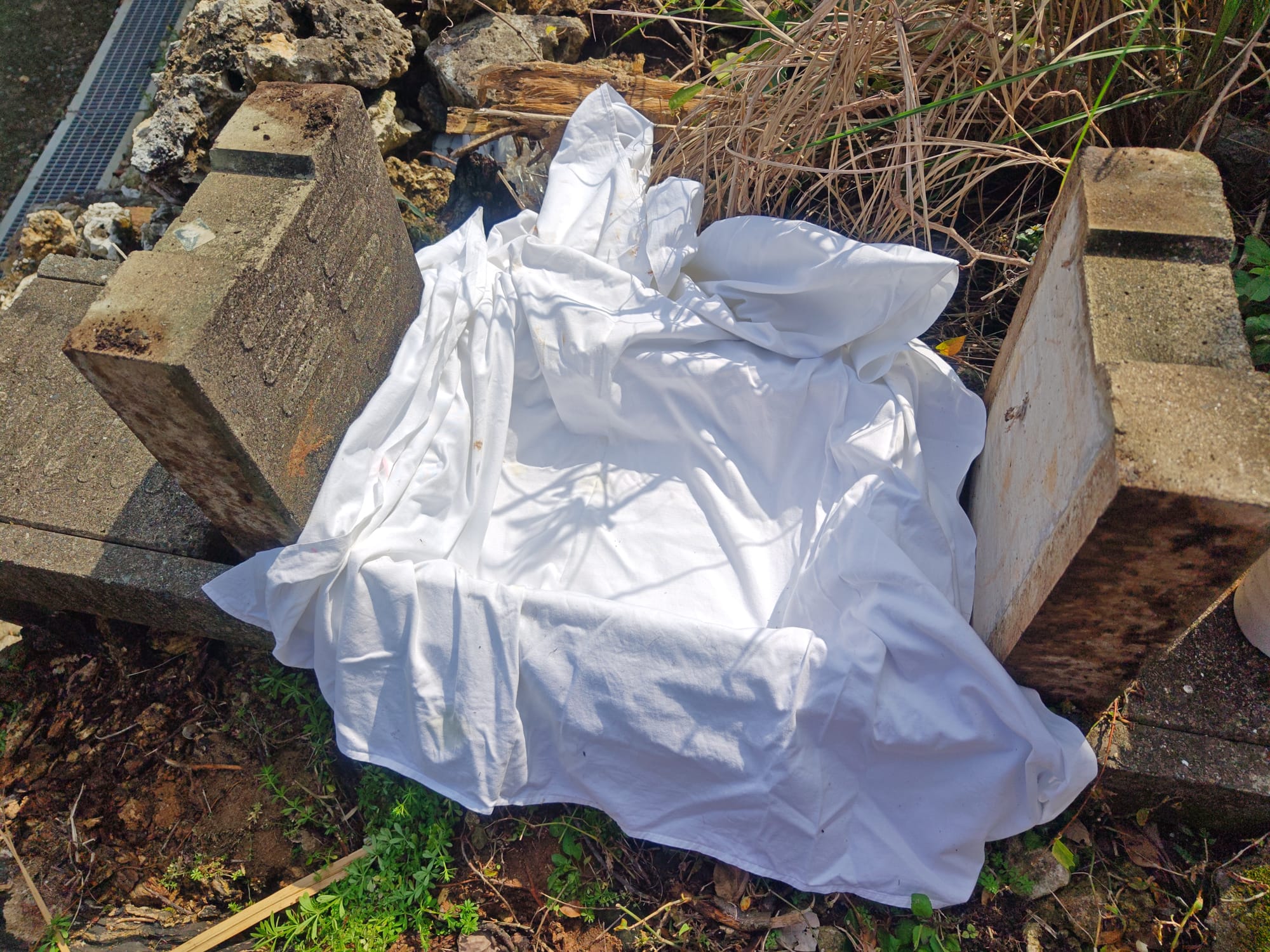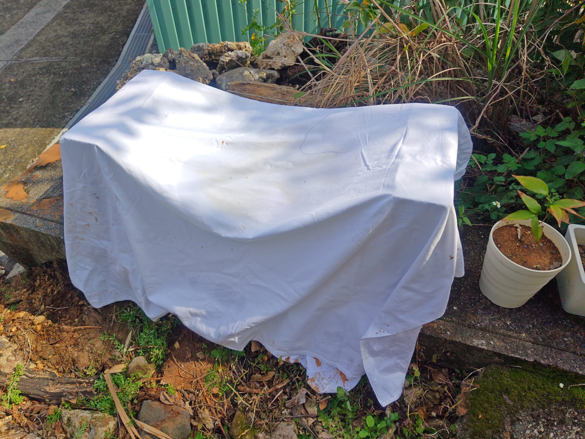 I placed the tray over a stone storm gutter near my house. This was fine as the filter was so effective that almost no sediment escaped the system and only water drained away. The remaining fabric could be propped up over the straining basin to prevent contamination from the foreign matter that the wind was always inevitably going to deposit in uncovered clay.