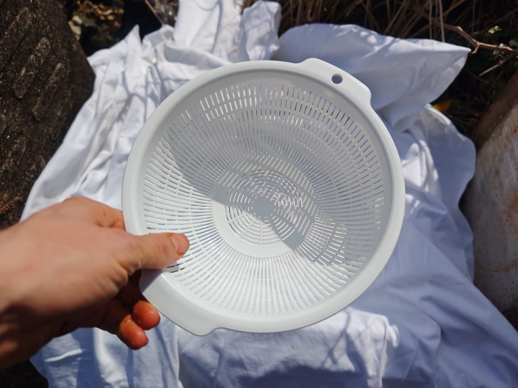 I was able to salvage a large bucket for soil collection and wet processing as well as several fishing crates for straining and drying the clay. I also found a kitchen strainer for separating organics from the liquid clay. By asking around, I was able to find someone with an extra curtain they were going to throw out eventually; a perfect liner material for the strainers. I was also able to borrow a trowel.
