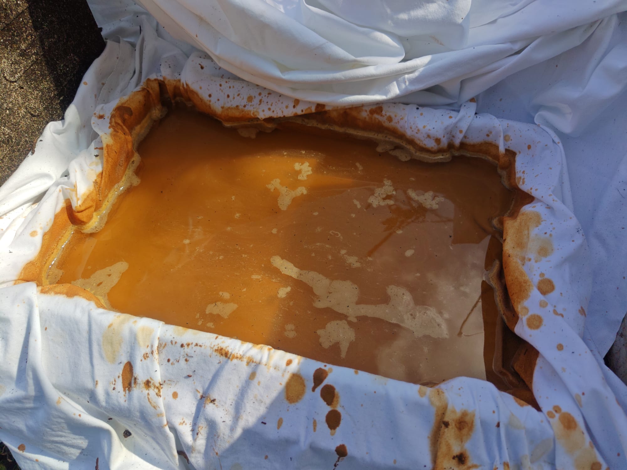 The fabric used was a rather tight cotton twill, and a kitchen strainer caught stray organic material.