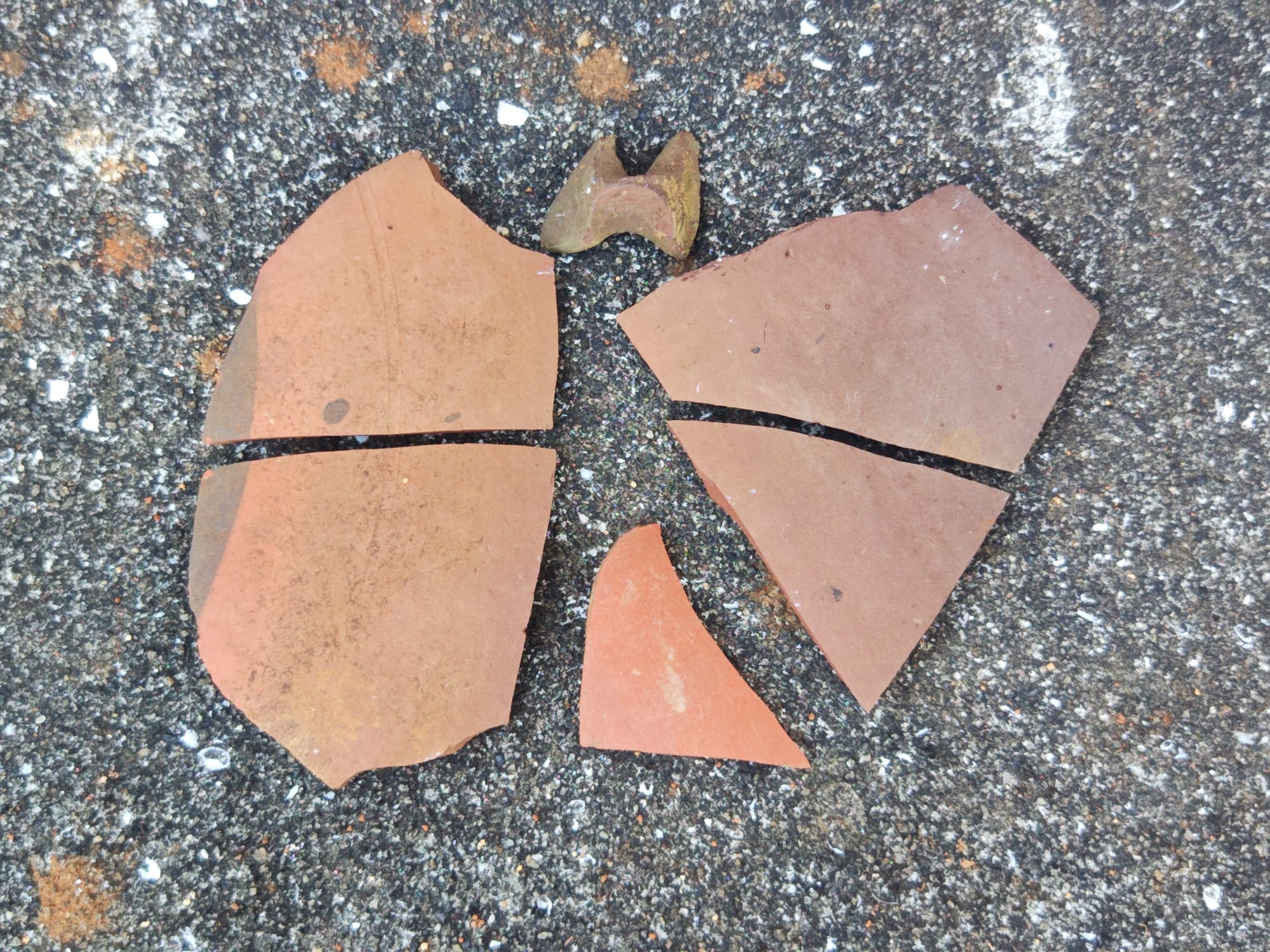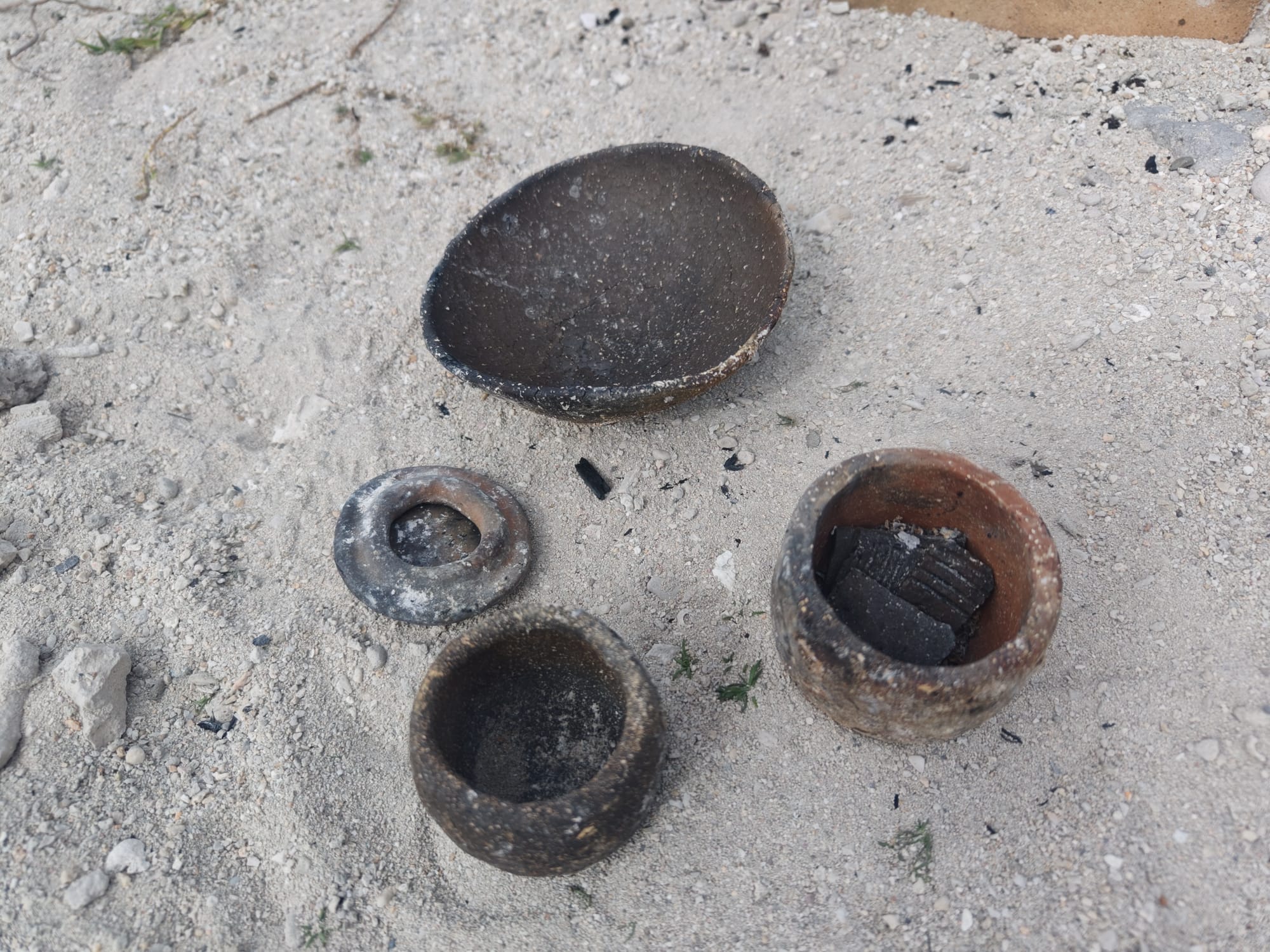 Ironically, the temper seems to have induced cracking rather than arrested it. While some resources indicate that clay tempered with such sands can be fired successfully below the decomposition temperature, I did not have any real control over the temperature of the firing. I am lucky that the pieces got hot enough for long enough to vitrify, at all. Further experimentation with clay/temper ratios and temper grain size may be necessary and improve future firings. It may also be best not to use high-calcium sand at all. I next plan on trying pieces without temper, altogether.