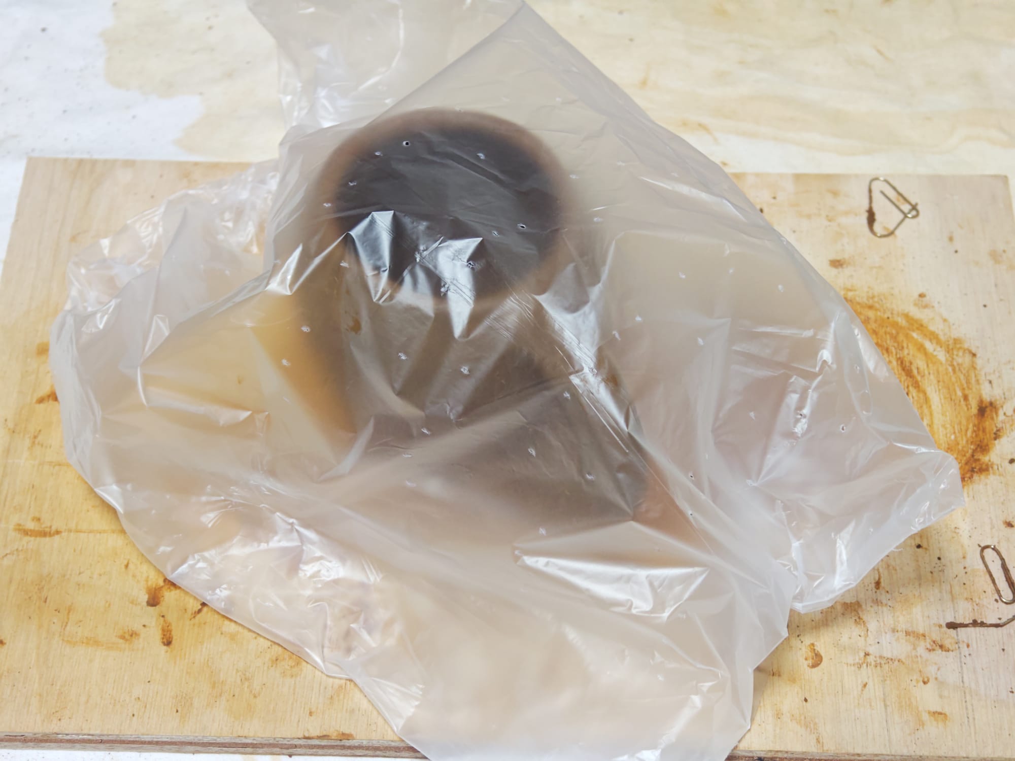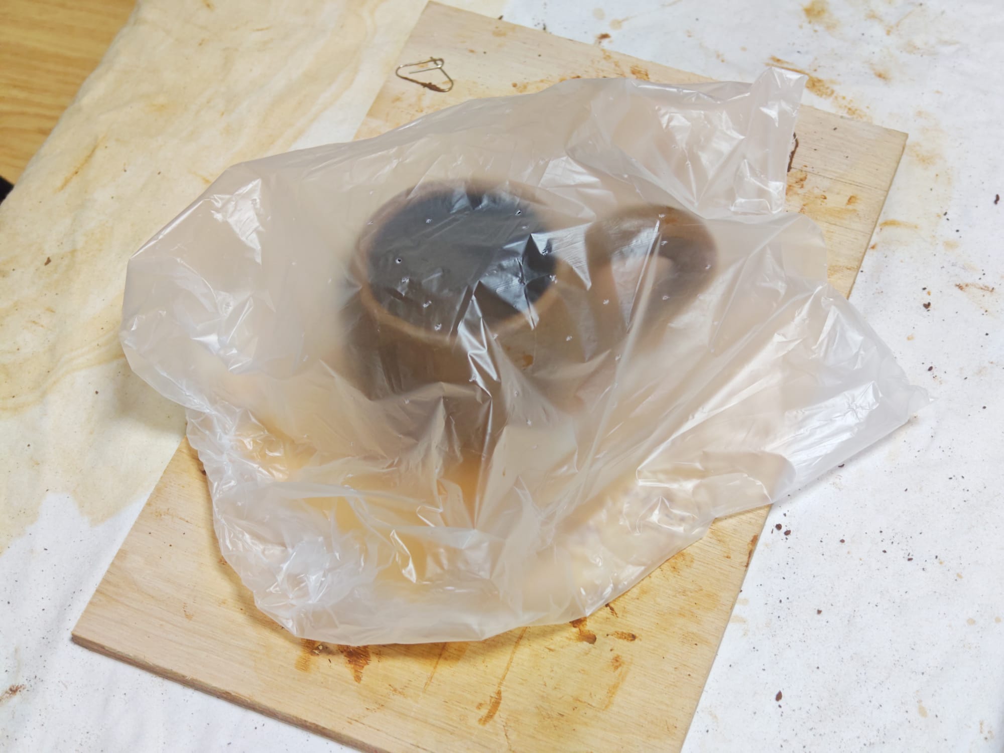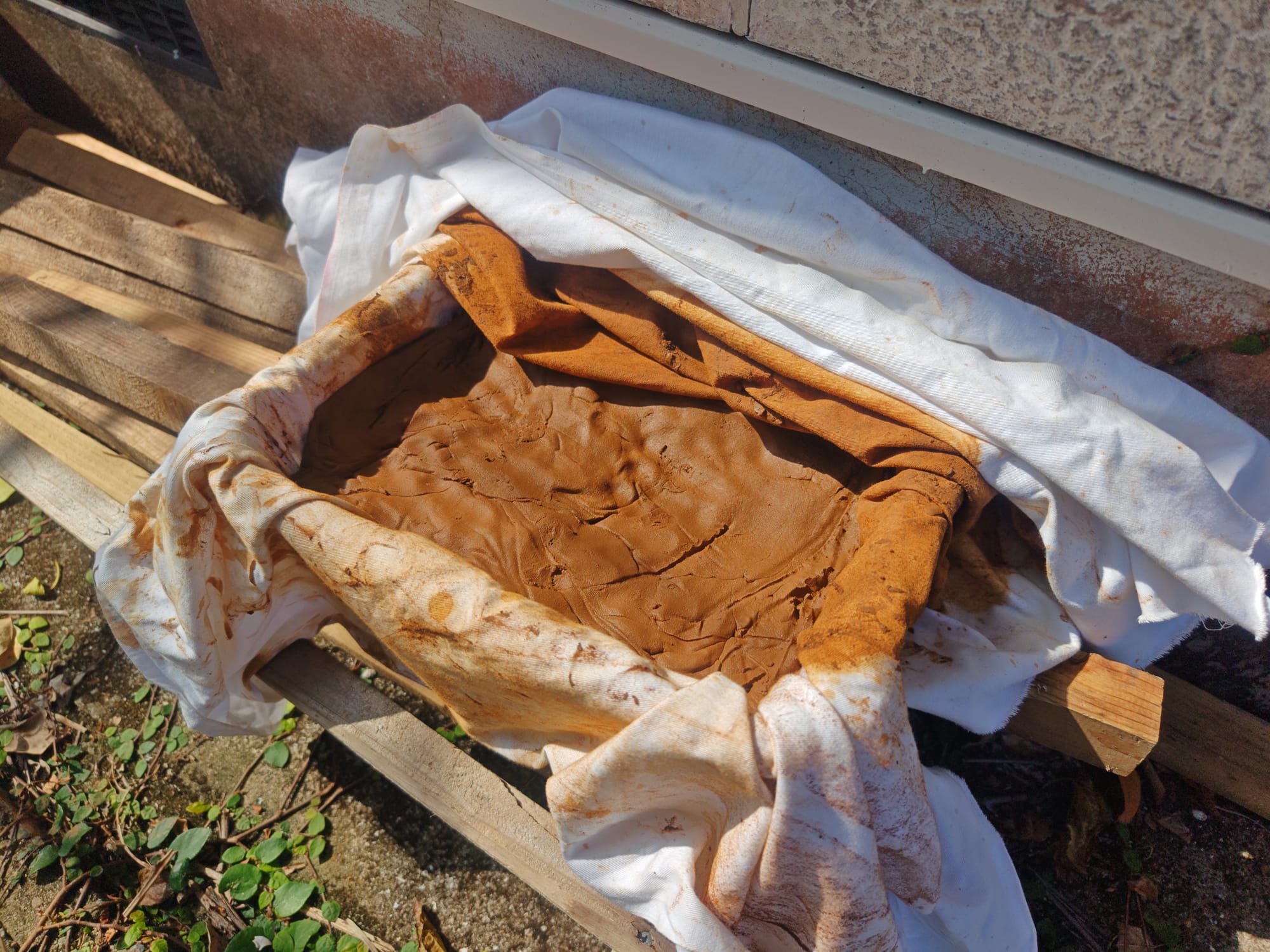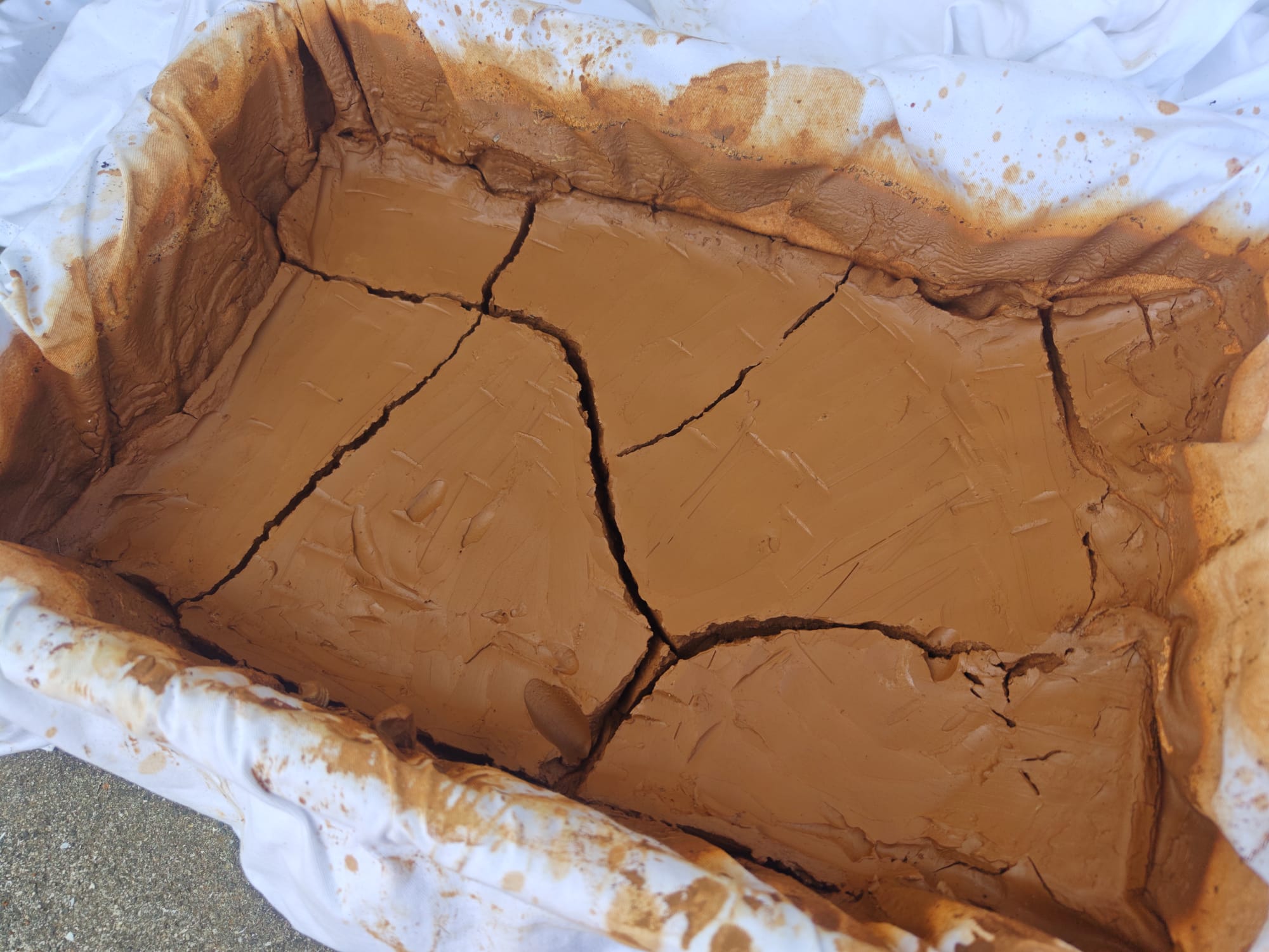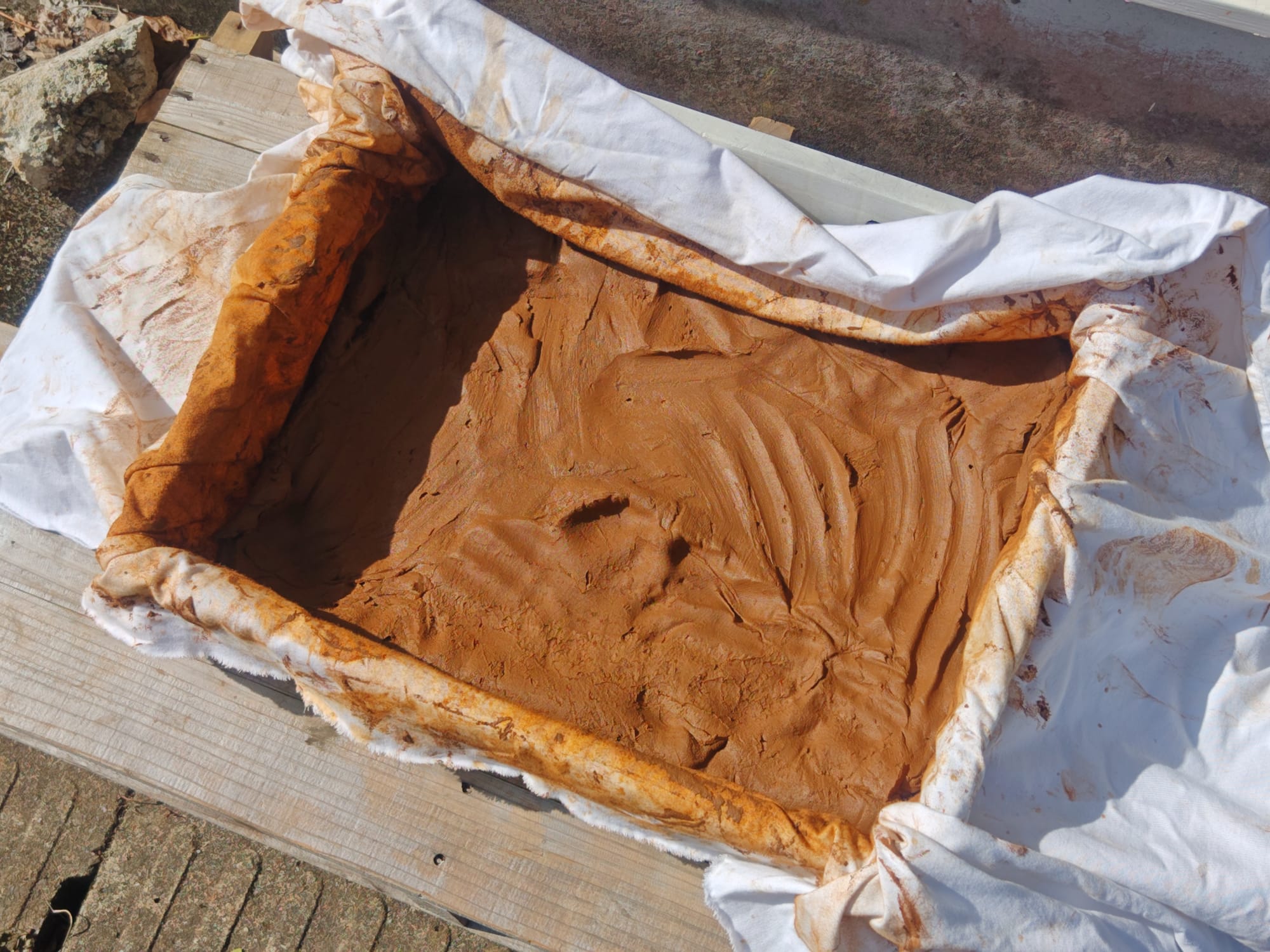 The next stage was the most time-consuming, but the least laborious part of the process. All that remained was waiting. Over the course of several days, gravity caused all the clay solids to settle out and much of the remaining water content eventually either drained through the fabric filter or evaporated off. Putting the straining tray in a sunny location helped speed this stage up.