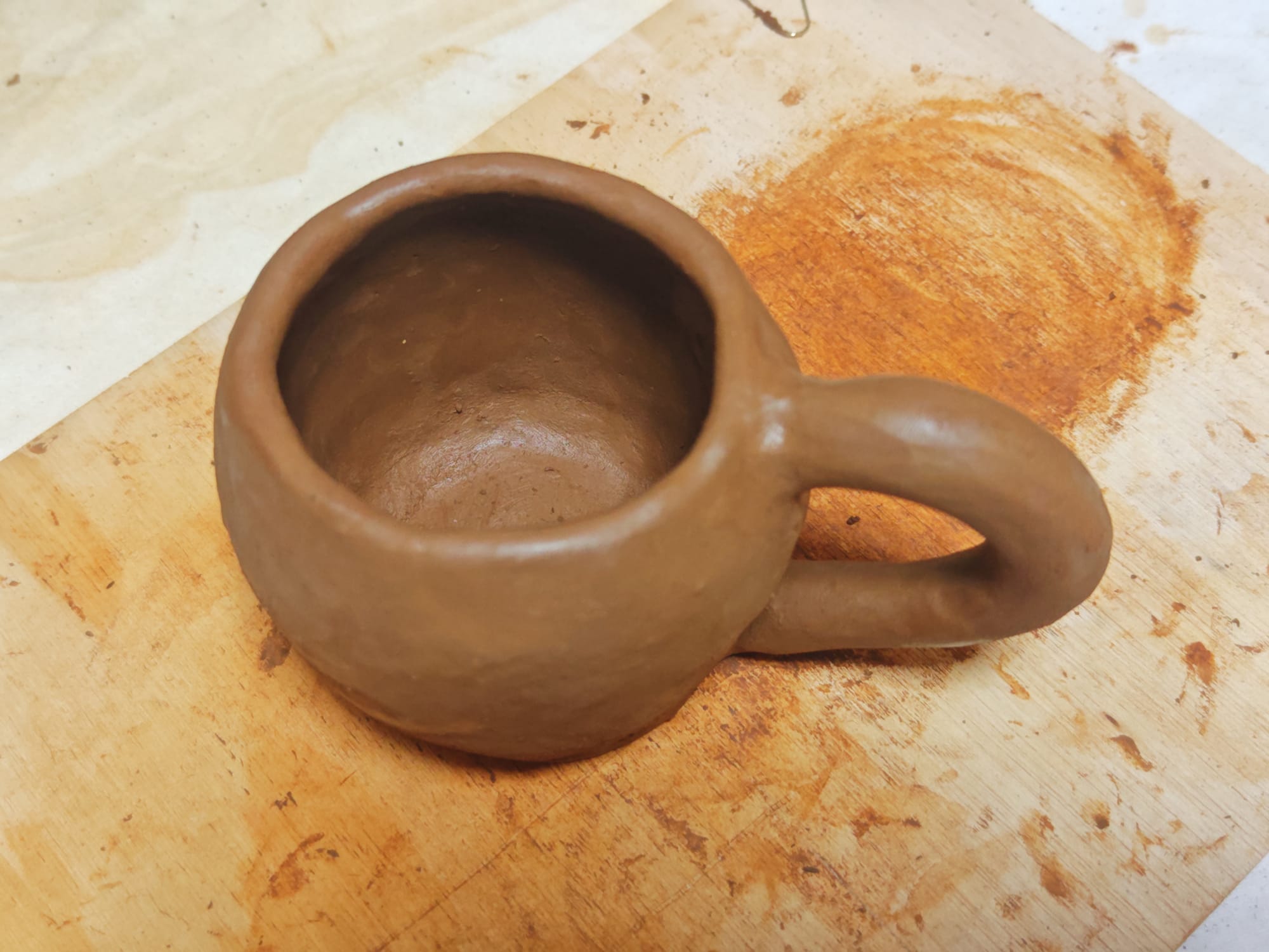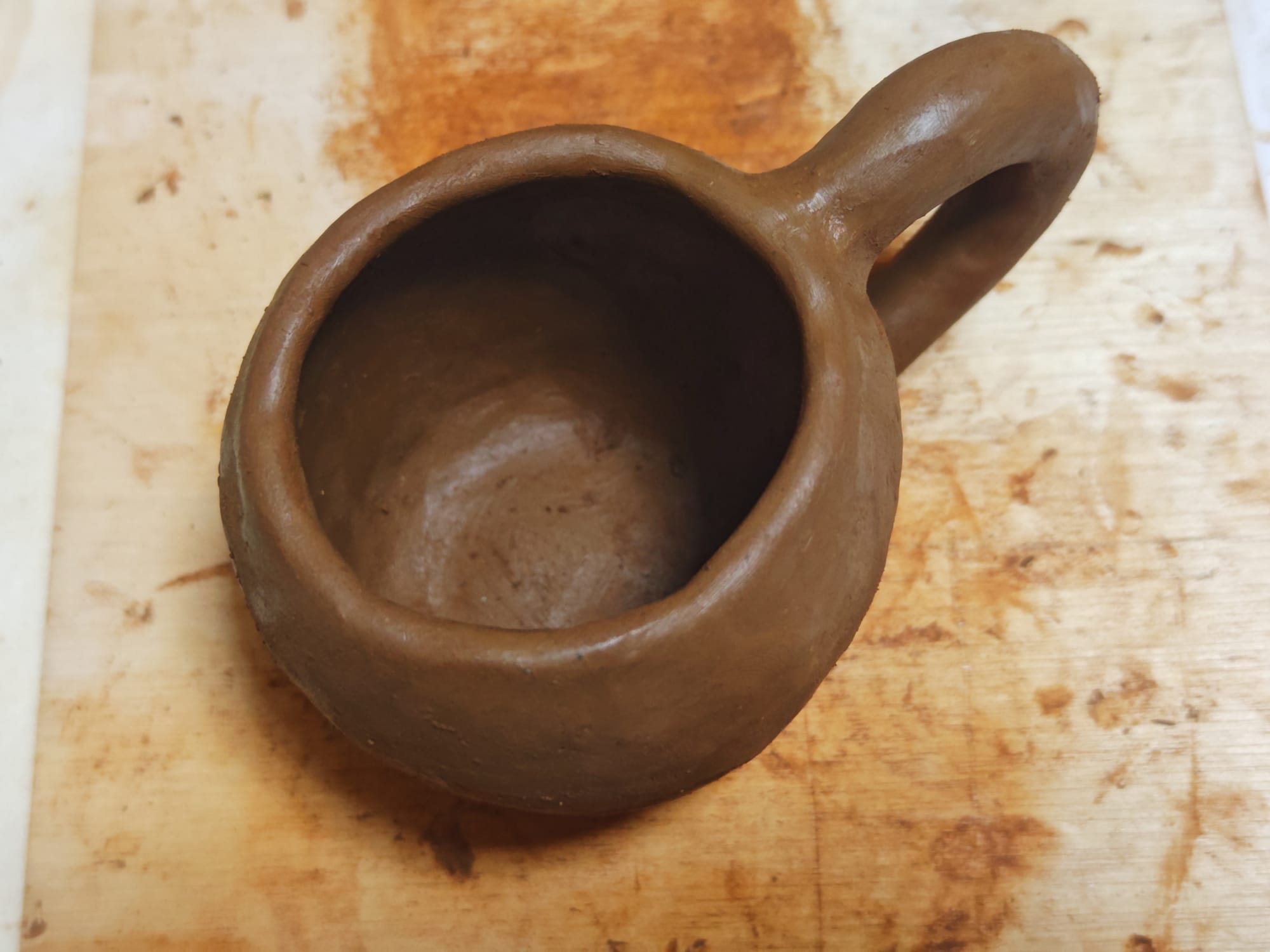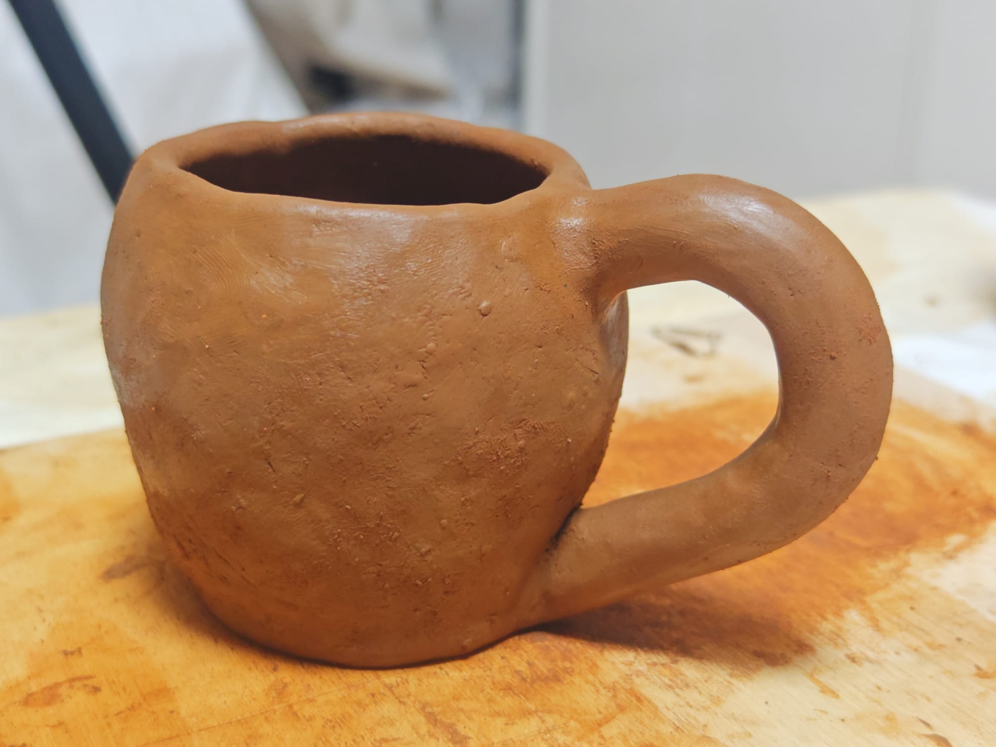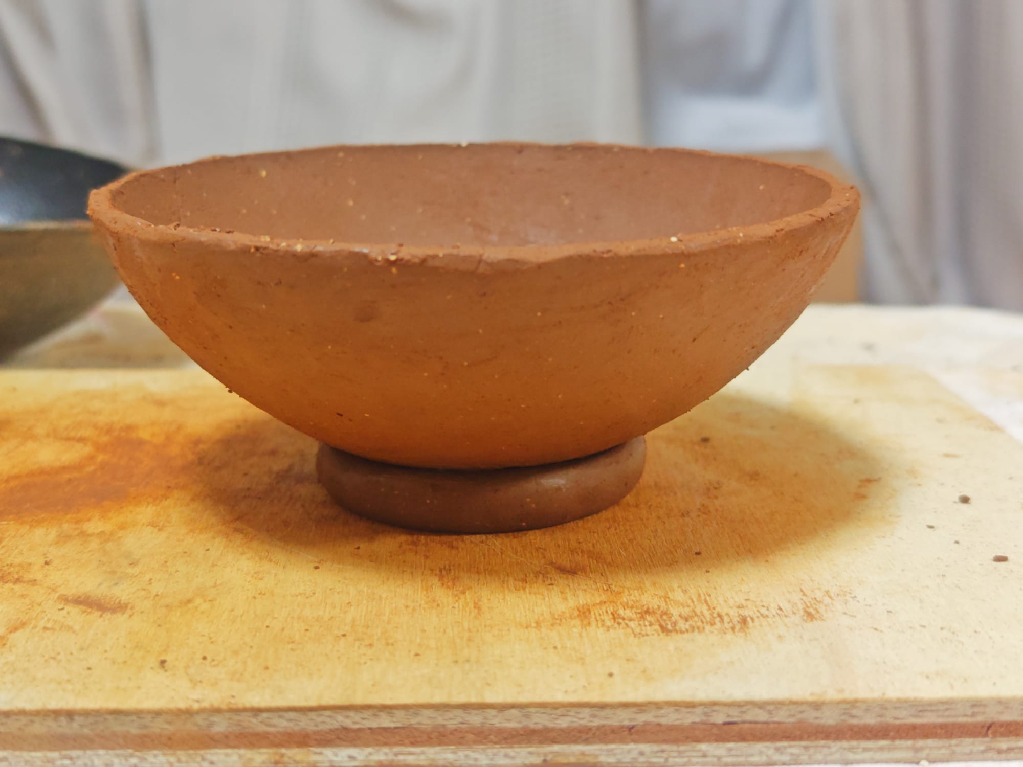 Since I lack a proper pottery wheel, I ended up making my first piece using the pinch-pot technique. By rolling coils of clay, layering, pinching, and scraping, I was able to make a rudimentary mug, some jars, and a bowl.