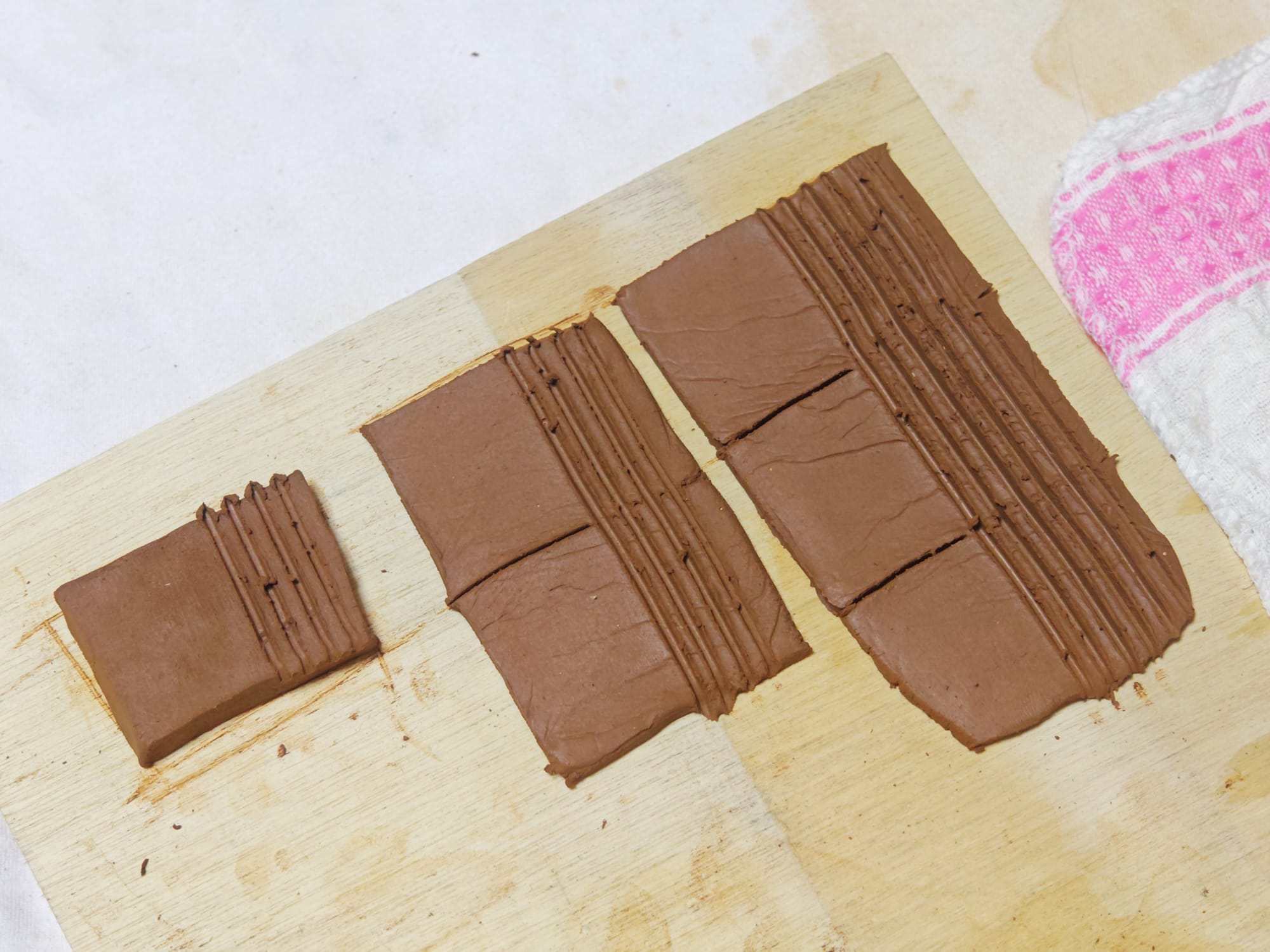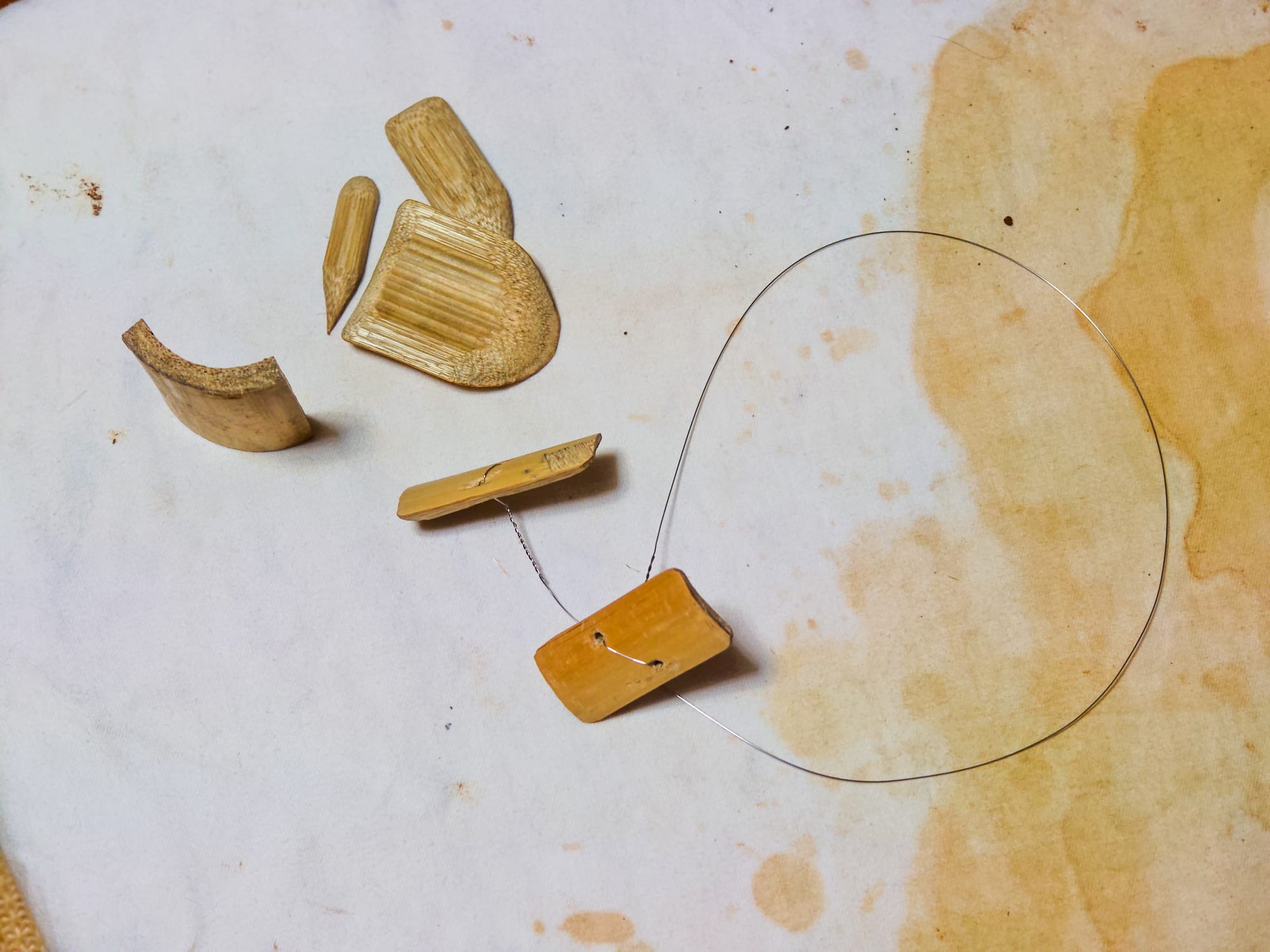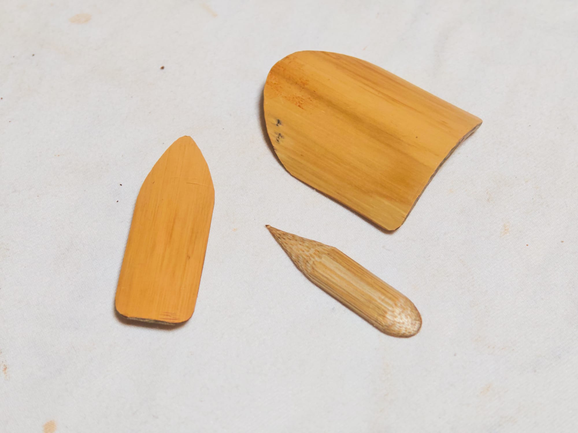 Covering the pieces with perforated plastic bags allowed them to dry slowly enough to minimize cracking due to shrinkage without stalling drying completely. I made several small sample tablets for testing different firing methods. I also made a set of rudimentary tools by carving some bamboo and cutting up buoys found on the seashore.