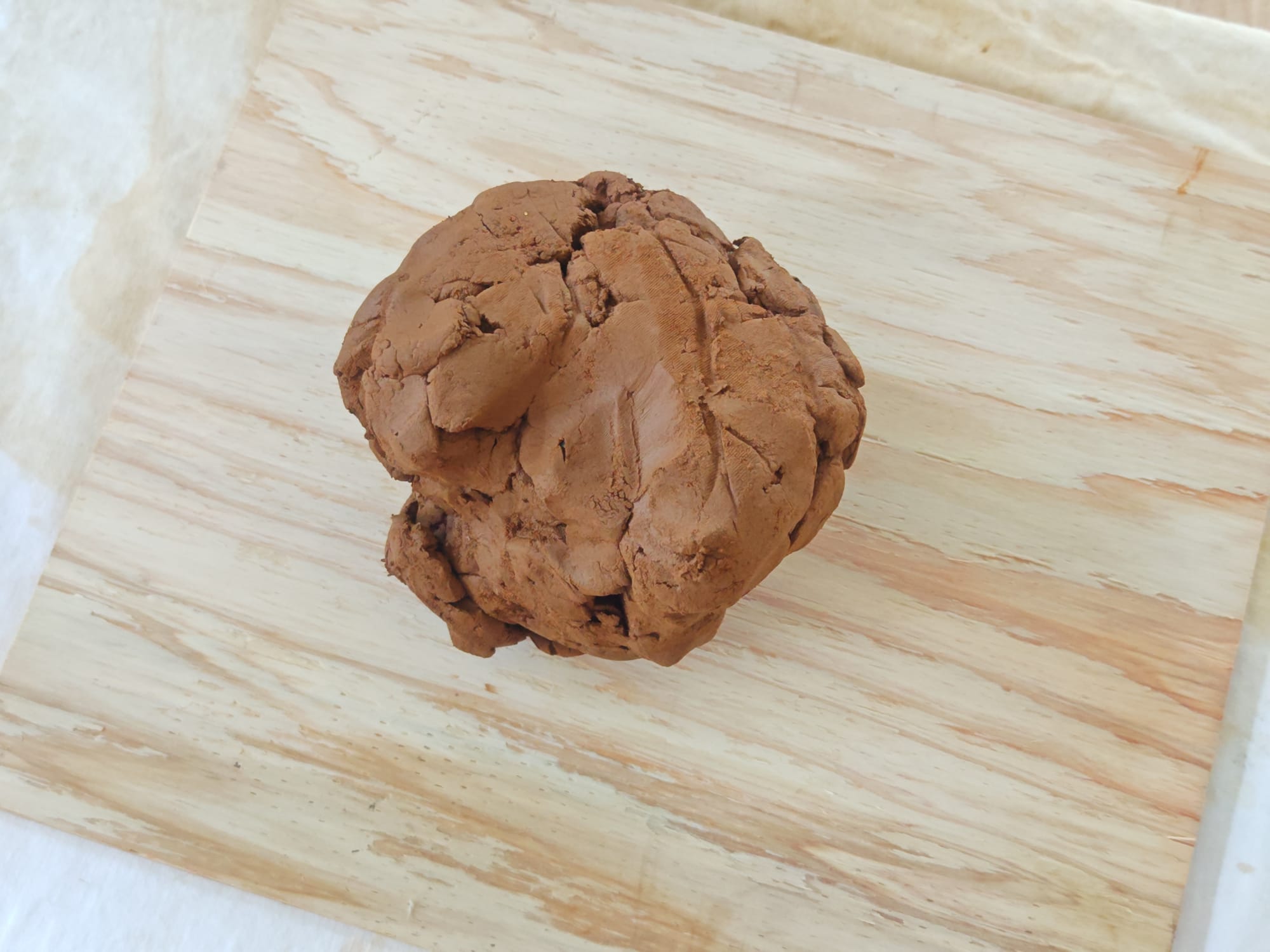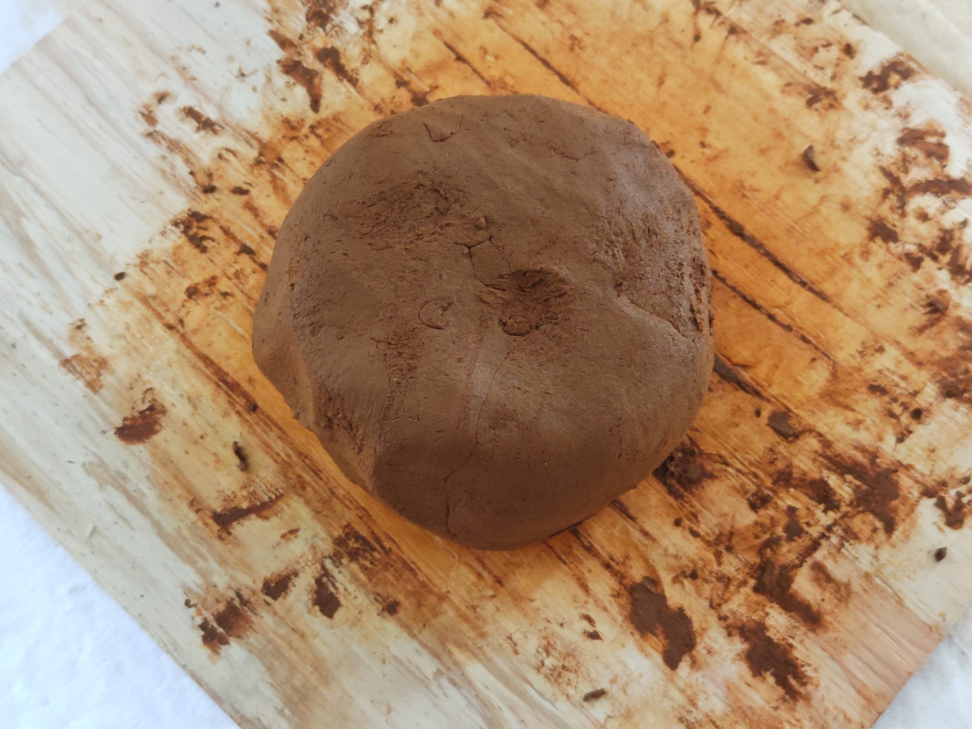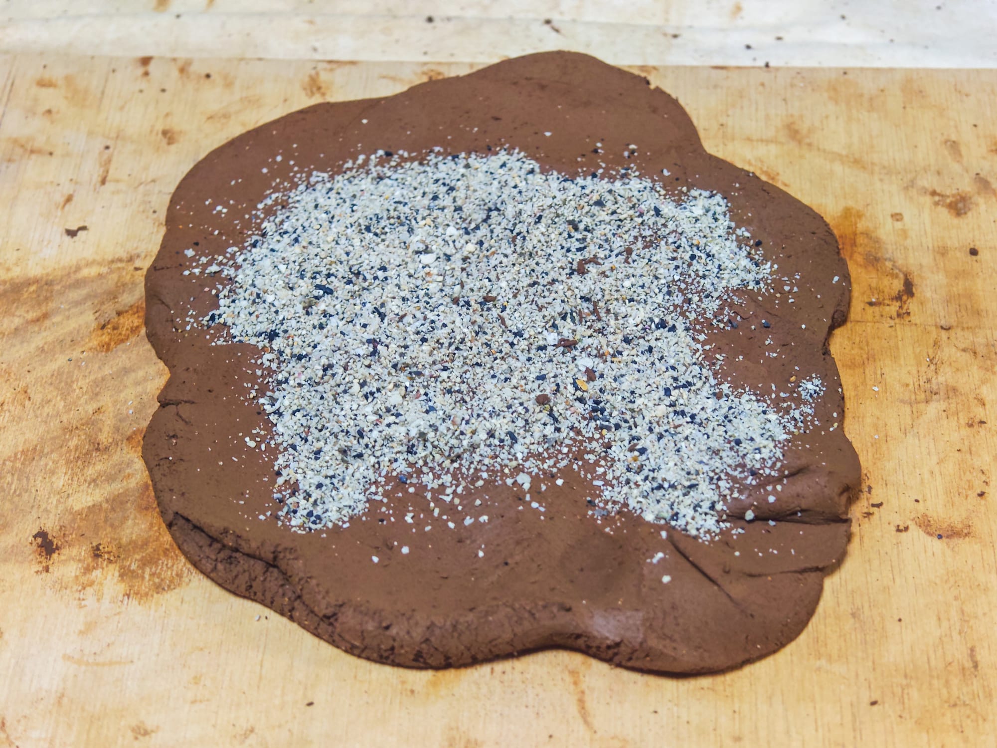 The clay shrank as it dried further, causing significant cracks to form (a good sign). Once it stopped being too sticky to handle, I scraped off the contaminants that fell on the surface during drying and thoroughly kneaded everything together. This kneading improves consistency, homogeneity, plasticity, and expresses trapped air bubbles in processed clay. At this point, grog or another temper material may be introduced to the raw clay to make modeling clay, so I added some of the sand I collected beforehand. Clay from other batches or recycled clay may also be worked in, at this stage. Working the clay in this way is known as wedging; it is a critical step in processing natural clay to achieve consistency.