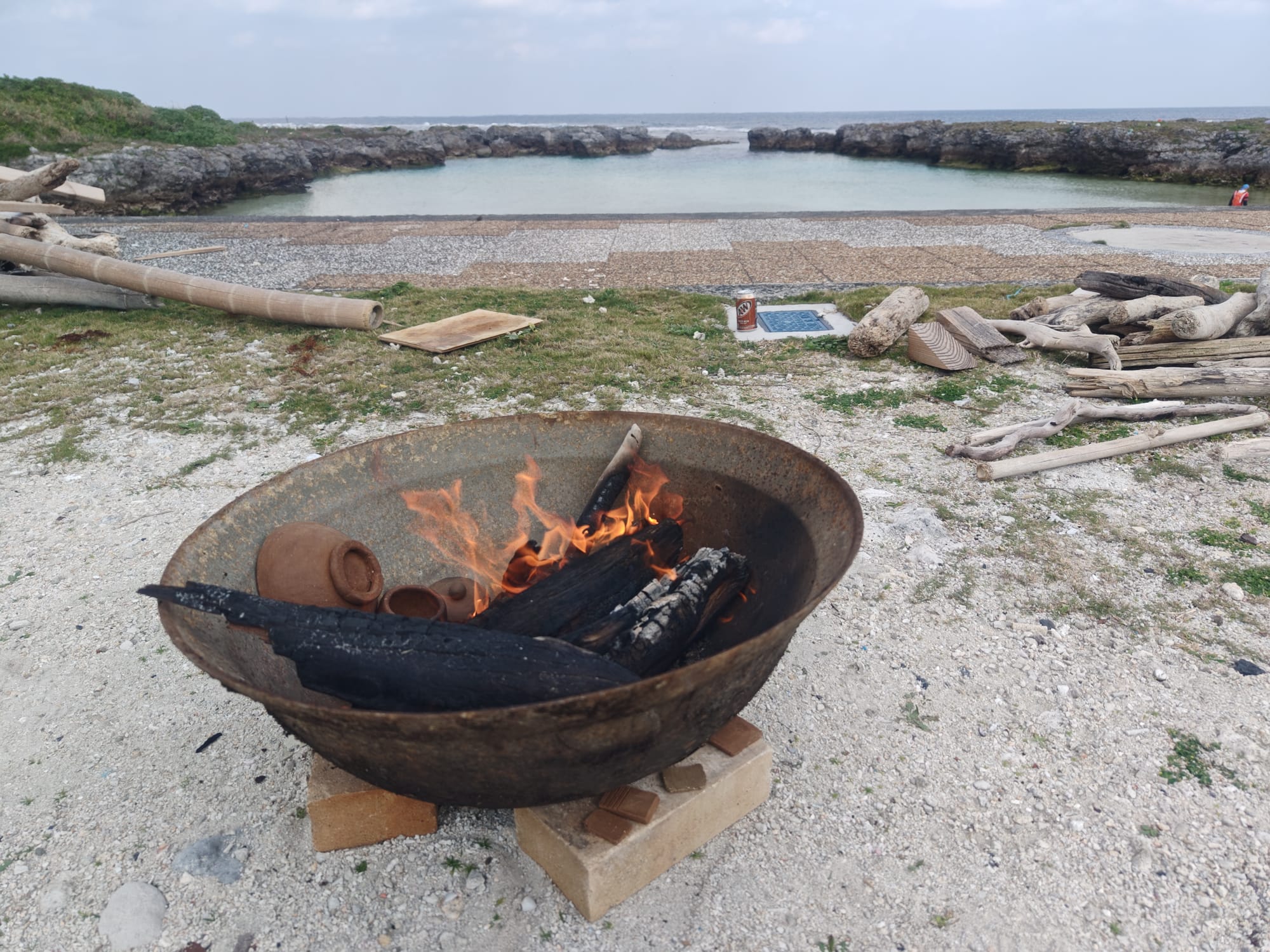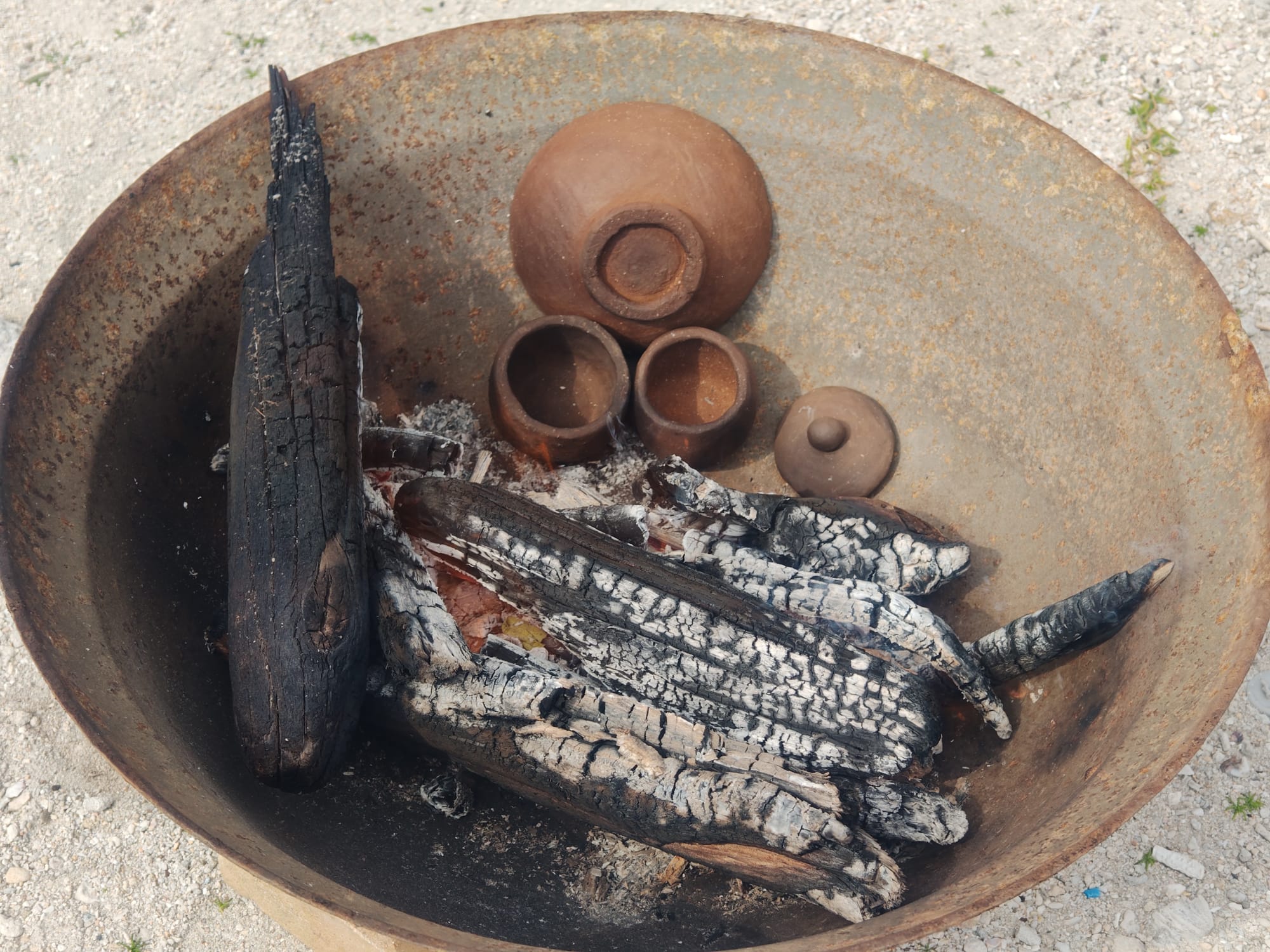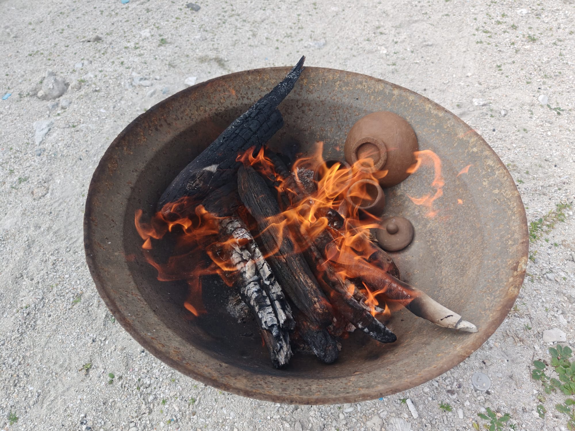 Working with the island caretaker, I was able to borrow an old iron basin to use as a fire pit, and I collected enough driftwood from the seashore to use as fuel. Pit firings like this go deceptively quickly, but the temperature swings are hard to control and results are unpredictable. Including starting the fire, preparing the bed of coals, preheating the pieces, firing, and cooldown, the whole process only took about 4.5 hours. Driftwood burns fast and hot, assuming its dry, so there were no problems getting up to temperature. Maintaining a consistent temperature, however, was somewhat harder.