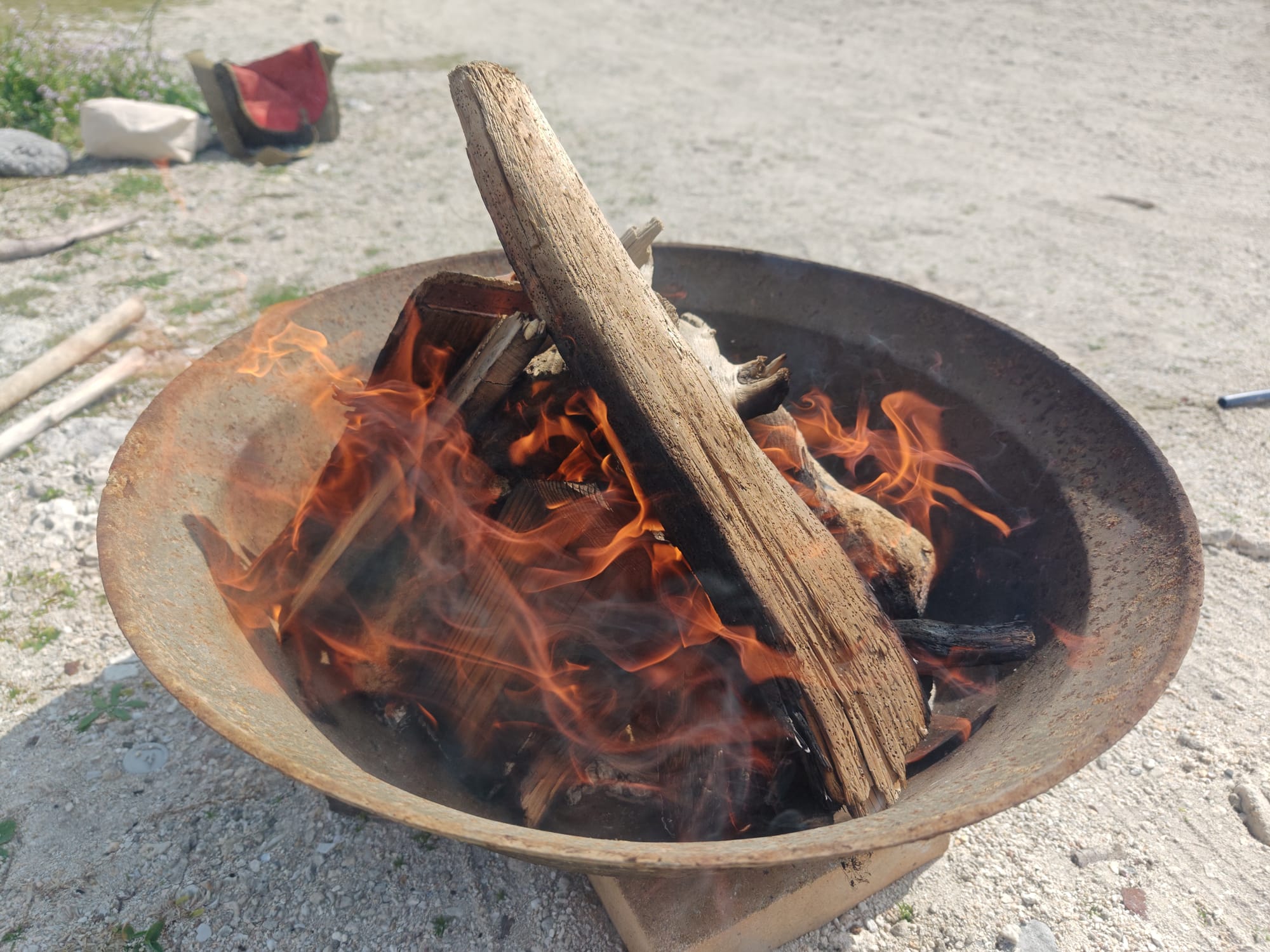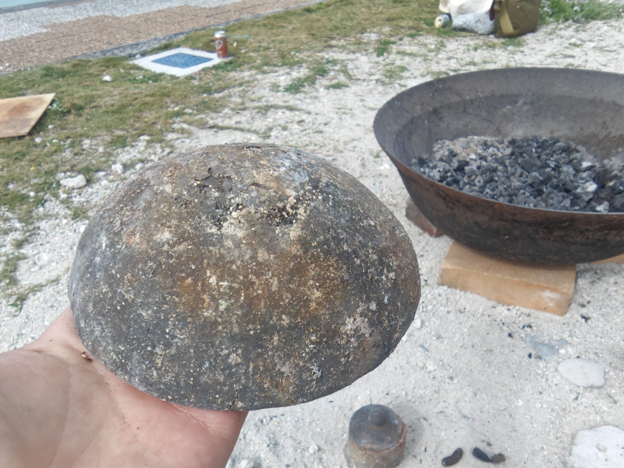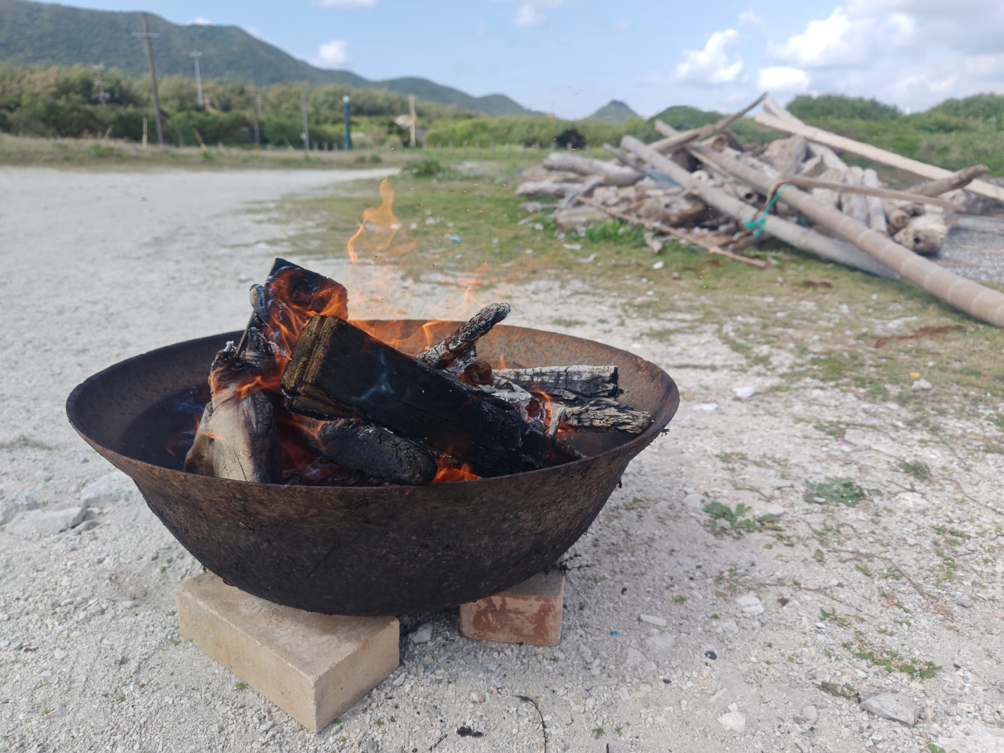 Working with the island caretaker, I was able to borrow an old iron basin to use as a fire pit, and I collected enough driftwood from the seashore to use as fuel. Pit firings like this go deceptively quickly, but the temperature swings are hard to control and results are unpredictable. Including starting the fire, preparing the bed of coals, preheating the pieces, firing, and cooldown, the whole process only took about 4.5 hours. Driftwood burns fast and hot, assuming its dry, so there were no problems getting up to temperature. Maintaining a consistent temperature, however, was somewhat harder.