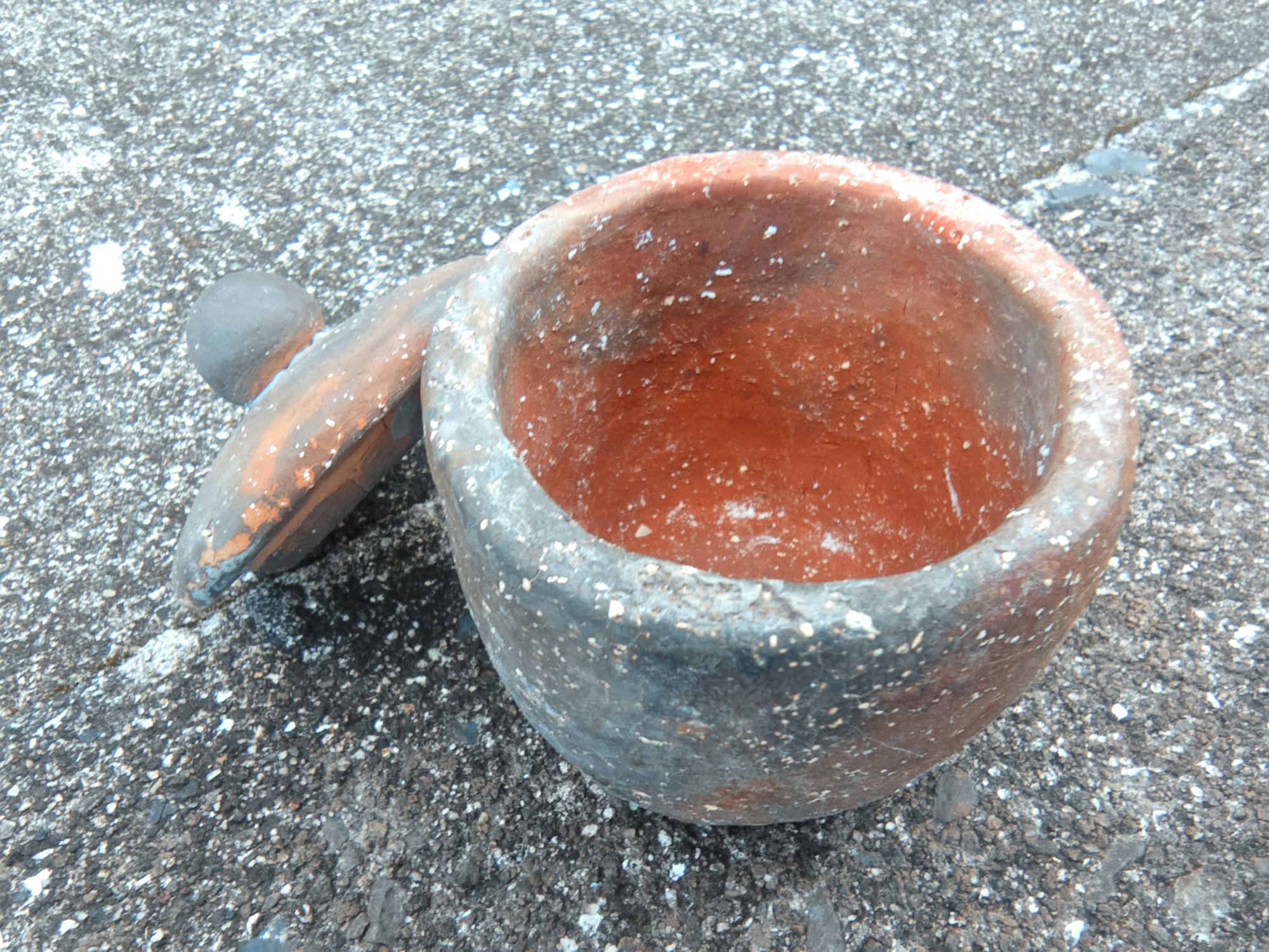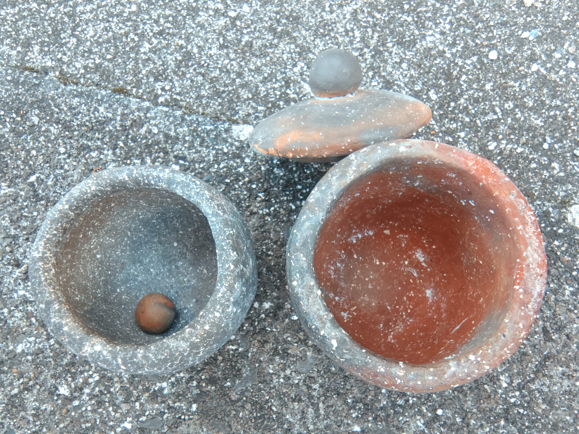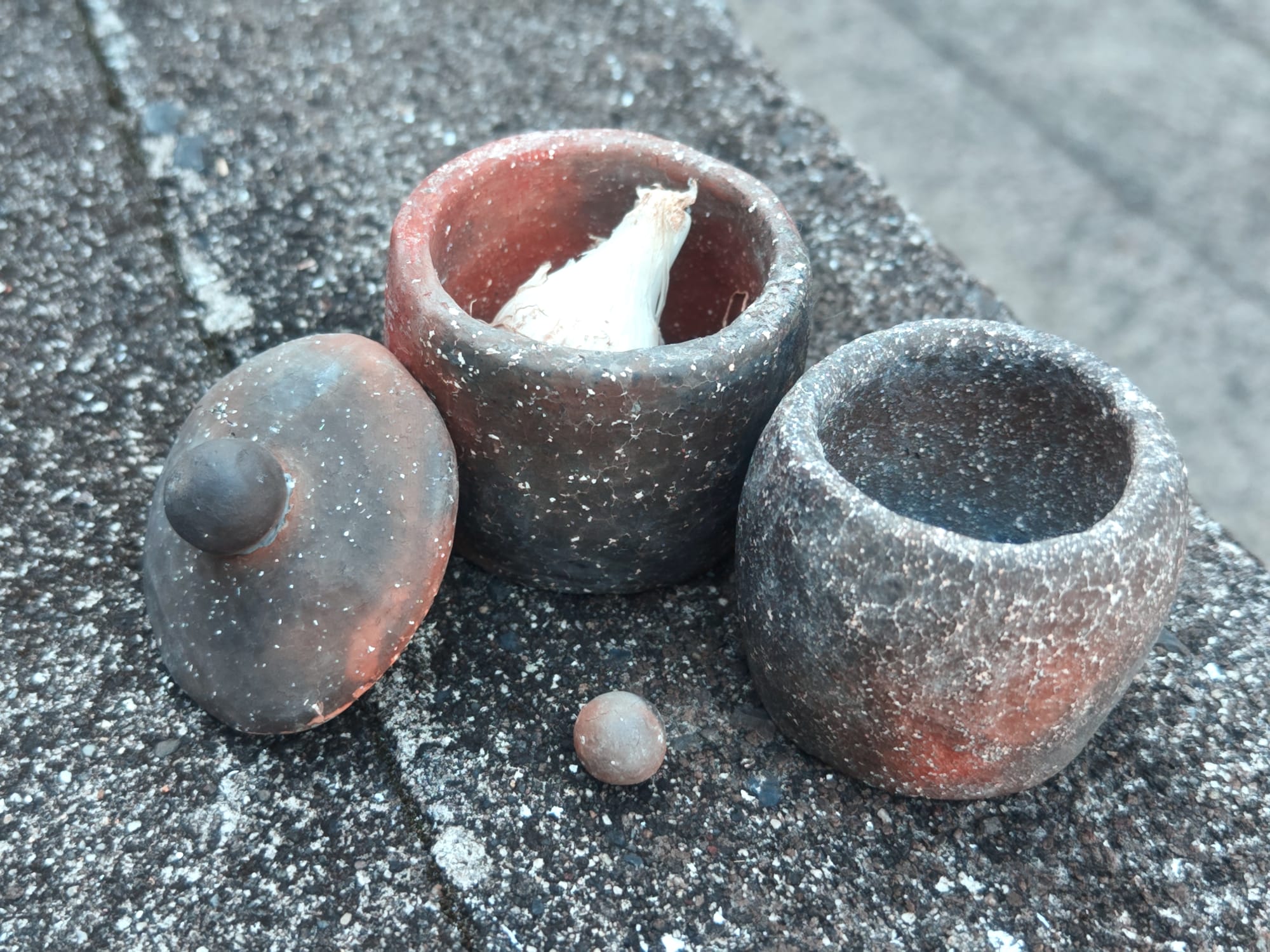 Apparently, either the decomposition reaction causes changes in volume, or the difference in thermal coefficient of expansion between the quick lime and the clay leads to pieces with quite a few fractures in them. The bowl came out particularly poorly as the thin walls were completely shot through with tiny cracks. Some pieces like the pot with lid were less effected.
