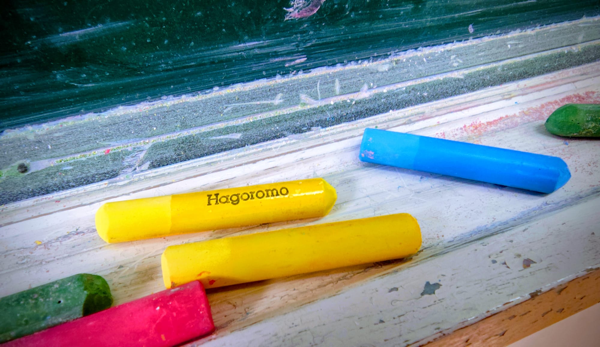 The chalkboards are, of course, the classic green variant; curved ever so slightly, they ease viewing from the center of the room, where students sit. Such a chalkboard consumes nearly an entire wall of each classroom. Best of all, the chalk is provided by the school, and it's all Hagoromo (IYKYK). The corduroy-clad foam chalkboard erasers make for a luxurious erasing experience.